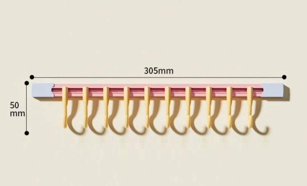 Sürgülü Kanca Sistemi: Ray üzerinde yer alan 10 adet kanca sağa ve sola serbestçe hareket edebilir. Bu sayede asacağınız eşyanın genişliğine göre aralıkları istediğiniz gibi ayarlayabilirsiniz.