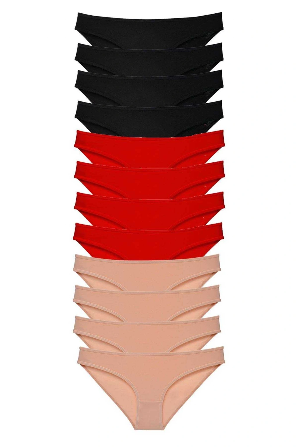 12 adet Süper Eko Set Likralı Kadın Slip Külot Siyah Kırmızı Ten