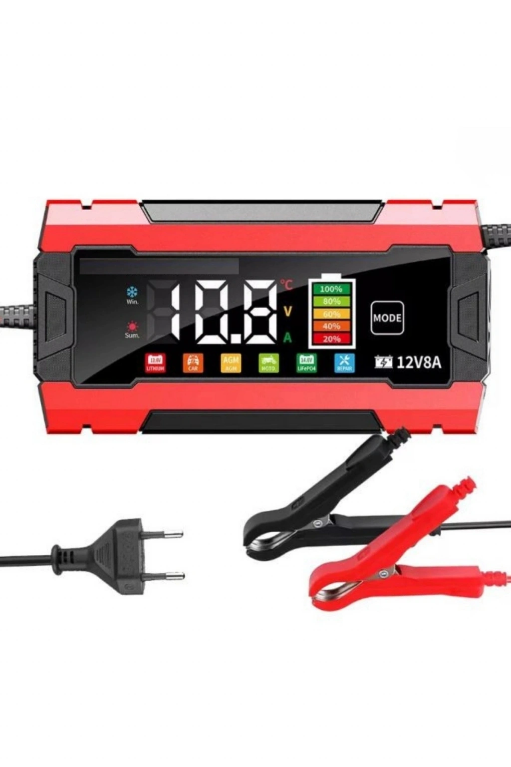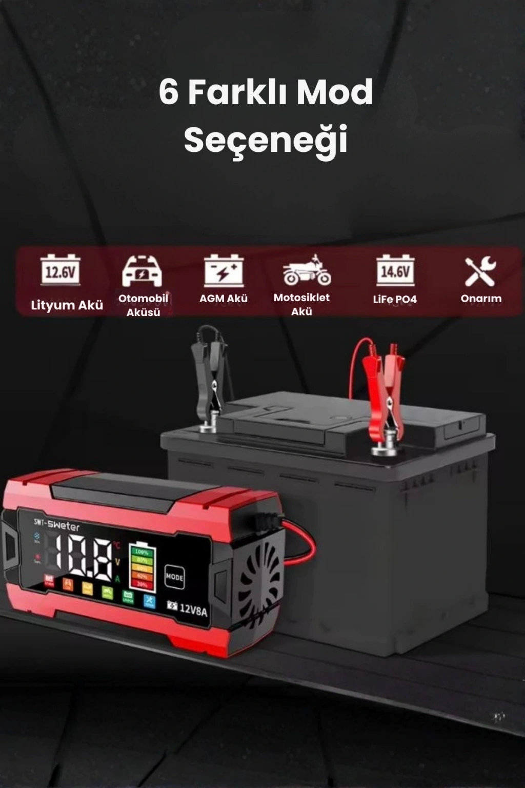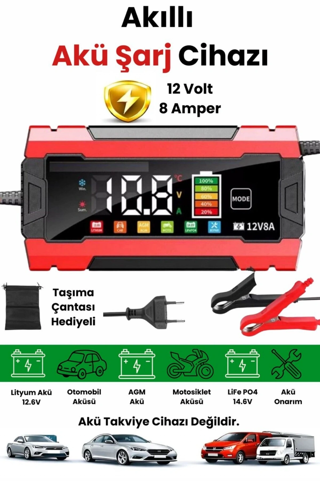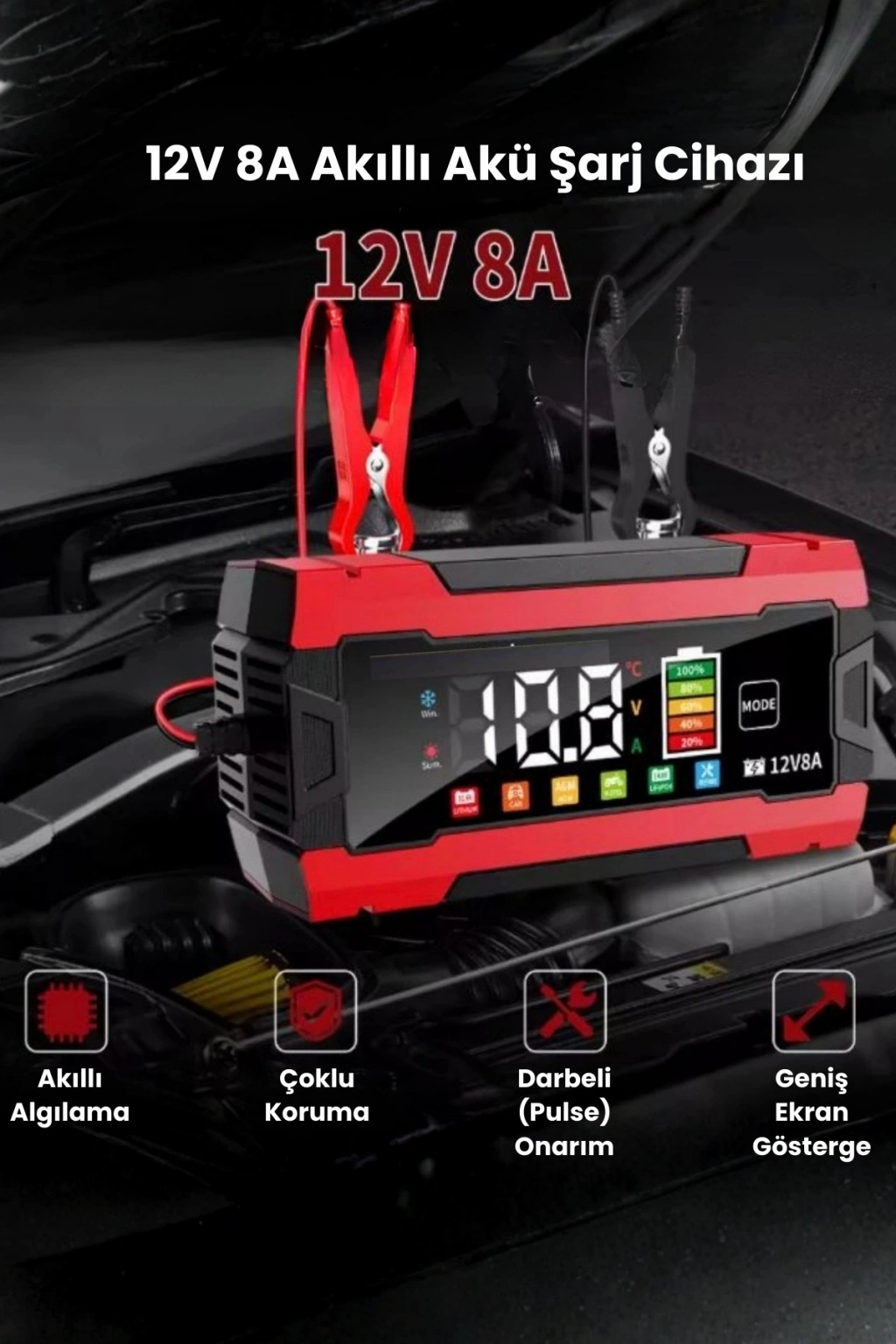 12V 8A Akıllı Akü Şarj ve Onarım Cihazı LiFePO4 Uyumlu • Pulse Repair Teknolojisi • Akıllı LCD Ekran Akünüzü yalnızca şarj etmekle kalmayın, ona bakım yaparak ömrünü uzatın! Bu akıllı cihaz, 12V aküler için optimize edilmiş güçlü ve güvenli bir şarj çözümüdür.