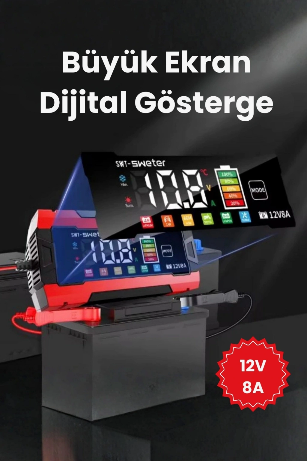 ? Akıllı LCD Gösterge Paneli Gerilim (V), Akım (A), sıcaklık ve şarj durumu gibi tüm verileri anlık olarak ekranda gösterir.