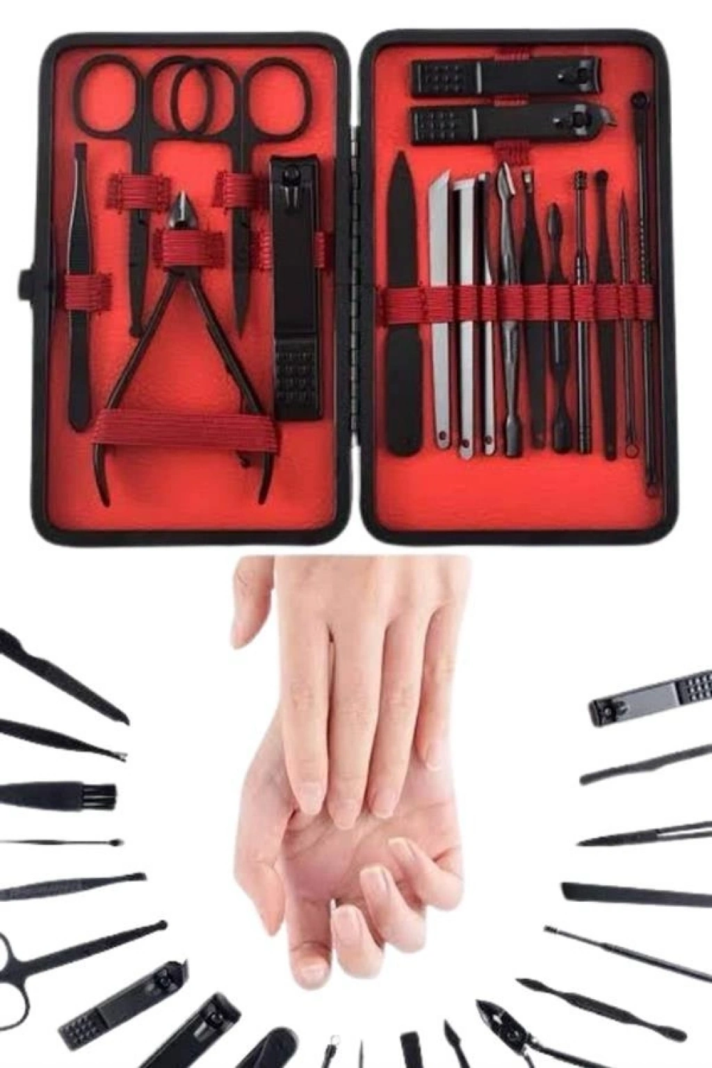17 parça manikür pedikür seti, hem el hem de ayak bakımı için ihtiyaç duyacağınız tüm malzemeleri içerir. Paslanmaz çelikten üretilmiş olan set, dayanıklılık ve uzun ömür sağlar, ayrıca güvenli sterilizasyon olanağı sunar. Yeni nesil siyah kaymaz parlatma teknolojisi ile keskinlik artırılmış olup, es ve kullanım kolaylığı sağlar.Paslanmaz Çelik ve Yüksek Kalite:Tüm ürün parçaları, %100 paslanmaz çelikten üretilmiştir. Bu malzeme, sağlamlık ve dayanıklılık sağlar, korozyona karşı direnç gösterir ve enfeksiyon riskini minimize eder. Keskin ve düzgün kesimler yak, tırnak bakımını profesyonel seviyeye taşır.Şık ve Taşınabilir Deri Çanta:Set, şık bir deri kaplama çanta ile birlikte gelir. Fermuarla kolayca açılıp kapanabilen bu çanta, tüm aletleri düzenli tutar ve taşımasını kolaylaştırır. Hafifliği sayesinde, seti her gün çantanızda taşıyabilir veya seyahatlerde yanınıza alabilirsiniz.Kapsamlı Bakım Seti:Bu set, el ve ayak bakımının her aşamasını kolaylaştıran birçok araca sahiptir. İçeriğinde büyük ve küçük tırnak makasları, sivri uçlu tırnak makası, çift uçlu komedon, törpü, et ittirici, pedikür bıçakları ve daha birçok kullanışlı alet bulunur. Bu araçlarla tırnak bakımınızı profesyonel seviyeye çıkarabilirsiniz.Sağlık ve Temizlik:Ürünler, kolayca temizlenebilir ve sterilize edilebilir özelliklere sahiptir. Bu da hijyen açısından büyük önem taşır, çünkü enfeksiyon riskini en aza indirir. Paslanmaz çelik yapısı, uzun süreli kullanımda bile dayanıklılığını korur.Paket İçeriği: 1 adet büyük tırnak makası 1 adet küçük tırnak makası 1 adet sivri uç tırnak makası 1 adet çift uçlu komedon 1 adet törpü 1 adet et ittirici 1 adet çift taraflı tırnak kaldırma aleti 1 adet makas 1 adet pedikür bıçağı 1 adet çarpraz pedikür bıçağı 1 adet kavisli pedikür bıçağı 1 adet V şeklinde et itme 1 adet itme çubuğu 1 adet tırnak temizleme 1 adet cımbız 1 adet iğneli komedon 1 adet kulak temizlemeÖzellikler: Yüksek kaliteli paslanmaz çelik malzeme Şık ve taşıması kolay deri çanta Kolay sterilizasyon ve temizlik Tırnak bakımında profesyonel sonuçlar Seyahat dostu, taşınabilir yapı
