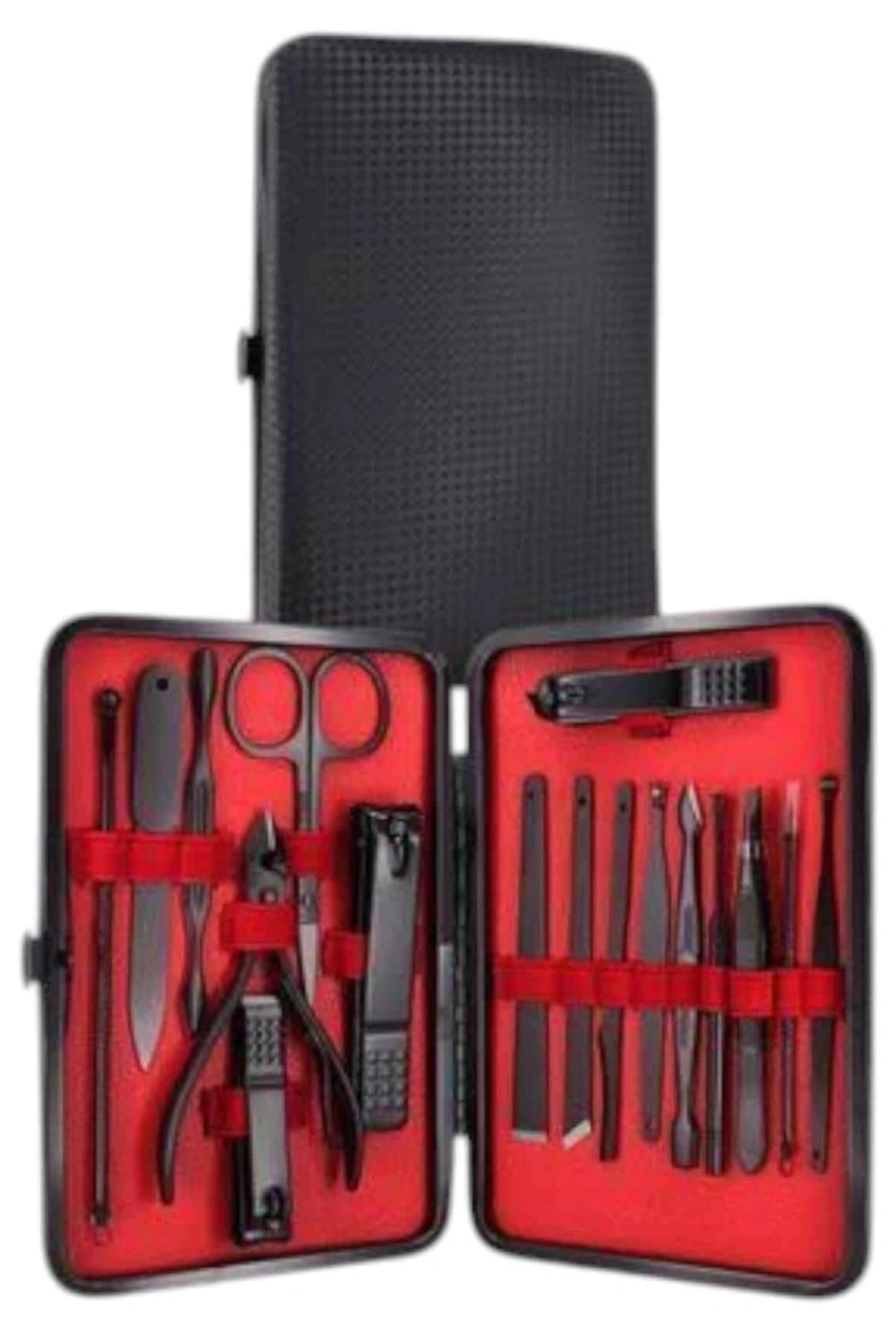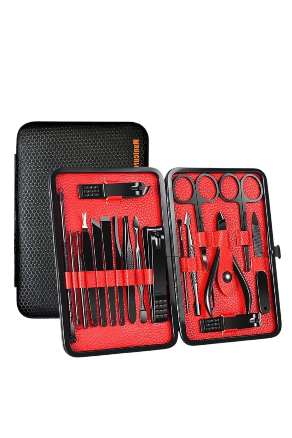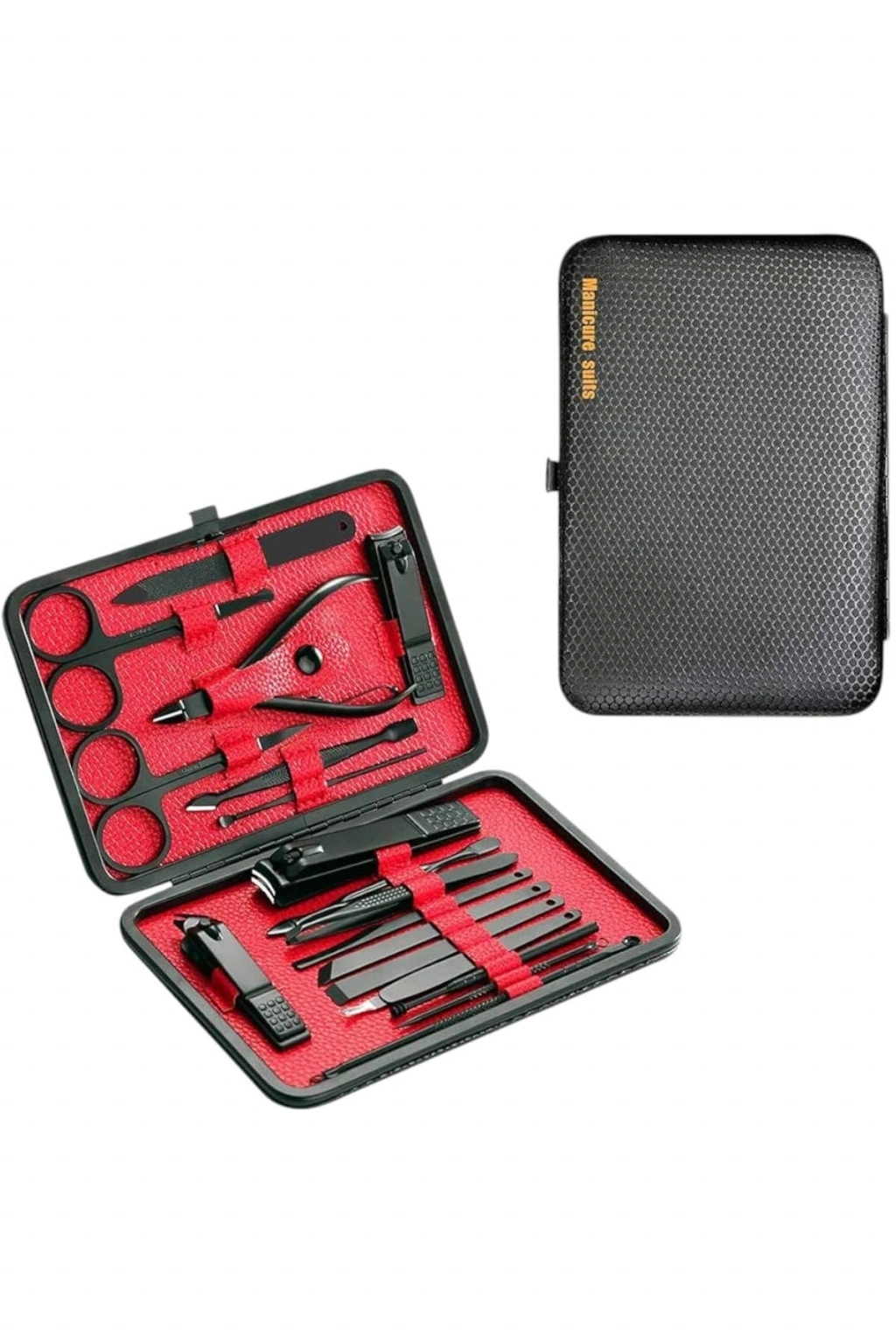 Özel tasarımıyla dikkat çeken bu 17 parçalık manikür seti, el ve ayak bakımınızı profesyonelce yapmanız için tüm gerekli malzemeleri bir araya getiriyor. Paslanmaz çelikten üretilmiş dayanıklı ve uzun ömürlü parçaları sayesinde güvenli sterilizasyon sağlar, kolay temizlenir ve korozyonu önleyerek hijyenik bir kullanım sunar. Yeni nesil siyah kaymaz parlatma teknolojisi ile üretilmiş keskin ve ergonomik tasarımı, kullanım kolaylığı ve es görünümü bir araya getirir.Şık ve sağlam deri kaplama kutusu sayesinde düzenli bir şekilde saklanabilir ve tek düğmeyle kolayca açılıp kapanabilir. Hafif ve taşınabilir yapısıyla çantanızda rahatça taşıyabilir, günlük kullanım veya seyahatlerinizde yanınızda bulundurabilirsiniz. Setin içeriğinde büyük, küçük ve sivri uçlu tırnak makasları, çift uçlu komedon, törpü, et ittirici, çift taraflı tırnak kaldırma aleti, makas, pedikür bıçakları, V şeklinde et itme atı, tırnak temizleme çubuğu, cımbız, iğneli komedon ve kulak temizleme atı bulunmaktadır.Her detayı düşünülerek tasarlanmış bu manikür seti, hem kendi bakımınızı pratik şekilde yapmanızı sağlar hem de sevdiklerinize hediye edebileceğiniz şık ve kullanışlı bir alternatif sunar.