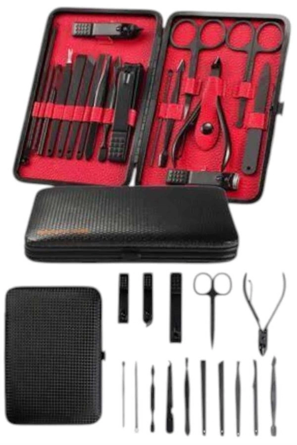 Özel tasarımıyla dikkat çeken bu 17 parçalık manikür seti, el ve ayak bakımınızı profesyonelce yapmanız için tüm gerekli malzemeleri bir araya getiriyor. Paslanmaz çelikten üretilmiş dayanıklı ve uzun ömürlü parçaları sayesinde güvenli sterilizasyon sağlar, kolay temizlenir ve korozyonu önleyerek hijyenik bir kullanım sunar. Yeni nesil siyah kaymaz parlatma teknolojisi ile üretilmiş keskin ve ergonomik tasarımı, kullanım kolaylığı ve es görünümü bir araya getirir.Şık ve sağlam deri kaplama kutusu sayesinde düzenli bir şekilde saklanabilir ve tek düğmeyle kolayca açılıp kapanabilir. Hafif ve taşınabilir yapısıyla çantanızda rahatça taşıyabilir, günlük kullanım veya seyahatlerinizde yanınızda bulundurabilirsiniz. Setin içeriğinde büyük, küçük ve sivri uçlu tırnak makasları, çift uçlu komedon, törpü, et ittirici, çift taraflı tırnak kaldırma aleti, makas, pedikür bıçakları, V şeklinde et itme atı, tırnak temizleme çubuğu, cımbız, iğneli komedon ve kulak temizleme atı bulunmaktadır.Her detayı düşünülerek tasarlanmış bu manikür seti, hem kendi bakımınızı pratik şekilde yapmanızı sağlar hem de sevdiklerinize hediye edebileceğiniz şık ve kullanışlı bir alternatif sunar.