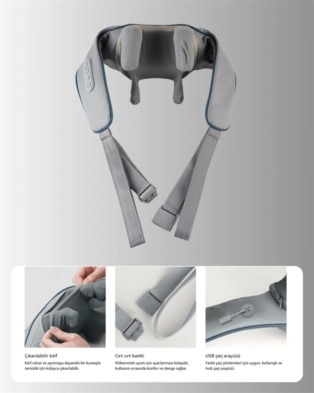 Her gün tekrar eden omuz ve boyun ağrılarından şikayetçiyseniz, tam aradığınız çözüm olabilir. Bu cihaz, insan eliyle yapılan masajın etkisini biyonik yoğurma teknolojisiyle birebir yaşatır.Gelişmiş ısıtmalı masaj fonksiyonu, masajla birlikte sıcaklık da uygulayarak kaslarınızın gevşemesine yardımcı olur. Özellikle soğuk günlerde ya da uzun süre masa başında çalıştıktan sonra mükemmel bir rahatlama sağlar.Üç kademeli hız ayarı ve iki farklı mod, her kullanıcının ihtiyacına göre özelleştirme sunar. Dilerseniz nazik bir günlük masaj, dilerseniz yoğun kas gevşetici bir seans tercih edebilirsiniz.Fırçasız motor sayesinde uzun süreli kullanımlarda bile ısınma veya ses problemi yaşanmaz. Sessiz çalışma özelliği, cihazı gece bile rahatça kullanmanıza olanak tanır.1800 mAh pil, uzun süreli kullanım için yeterli güç sağlar. Kablosuz çalışma özelliğiyle evde, iş yerinde veya araç içinde konfor sunar.U tasarımlı ergonomik yapısı, boyun ve omuz bölgesini tam kavrayarak etkili bir masaj sunar. Askılı yapısı sayesinde masaj sırasında eller serbesttir.