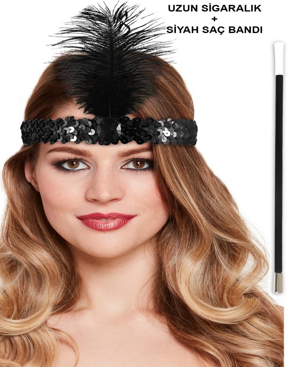 1920'ler Gatsby Aksesuar Seti – Siyah Charleston Saç Bandı & Sigaralık