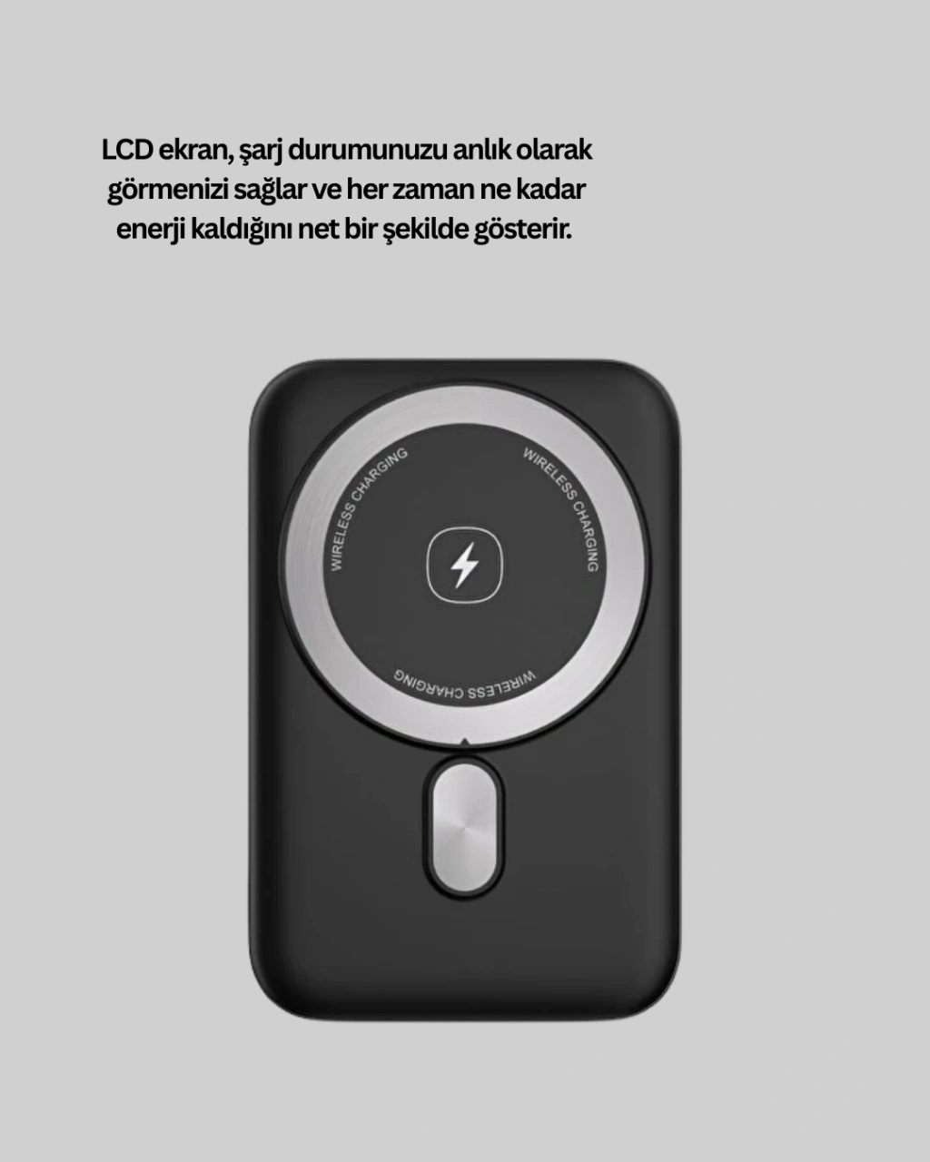 Manyetik kablosuz şarj destekli bu hızlı şarj powerbank, modern tasarımı ve güçlü performansı ile öne çıkar. Cihazınıza otomatik olarak hizalanarak kablosuz şarjı başlatır ve konforlu bir kullanım sunar.Hızlı şarj özelliği sayesinde kısa sürede yüksek verim elde edilir. Aynı anda birden fazla cihazı şarj edebilme imkânı sunarak günlük ihtiyaçlara pratik çözümler üretir. LCD ekran, kalan enerjiyi takip etmeyi kolaylaştırır.Minimalist ve kompakt yapısı sayesinde her ortamda rahatlıkla kullanılabilir.