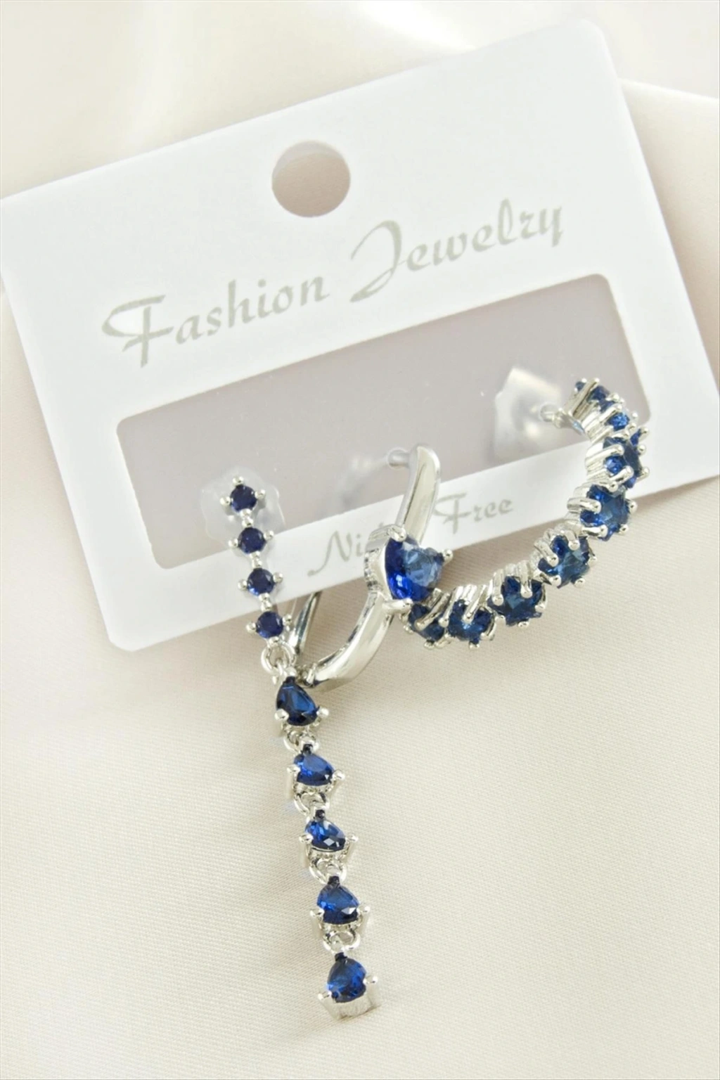 Küpe; Ürün malzemesi metal ve zirkon taşından imal edilmiştir. 1 sınıf kaliteli malzeme kullanılmıştır. Ürün boyu 2,5 cmdir. 1 kartta 3 adet küpe bulunmaktadır.