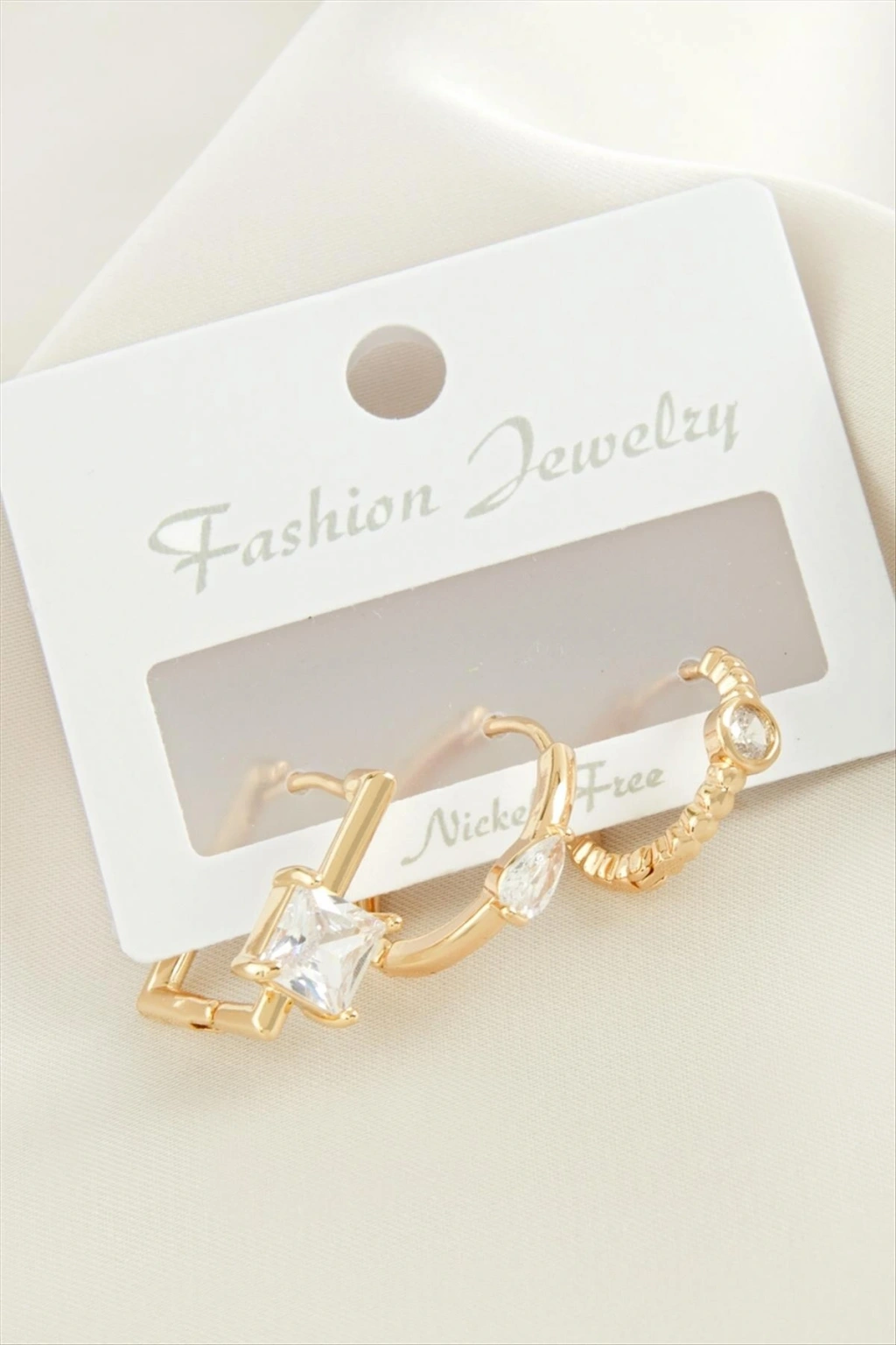 Küpe; Ürün malzemesi metal ve zirkon taşından imal edilmiştir. 1 sınıf kaliteli malzeme kullanılmıştır. Ürün boyu 3 cmdir. 1 kartta 3 adet küpe bulunmaktadır.