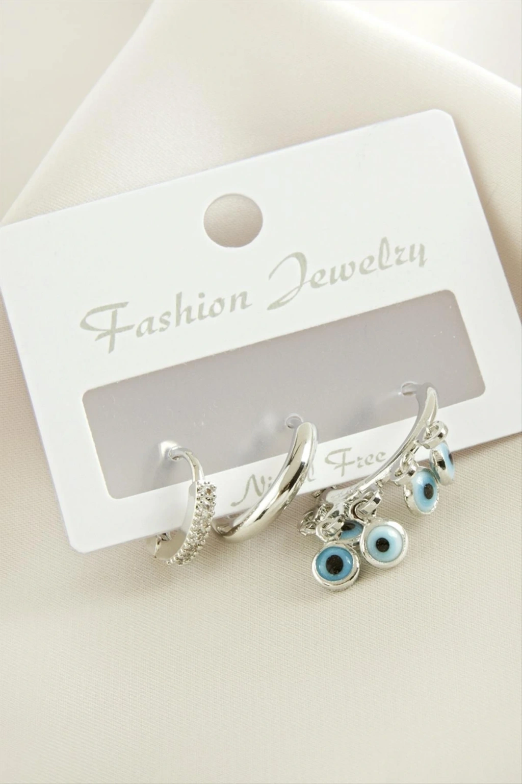 Küpe; Ürün malzemesi metal ve zirkon taşından imal edilmiştir. 1 sınıf kaliteli malzeme kullanılmıştır. Ürün boyu 2,5 cmdir. 1 kartta 3 adet küpe bulunmaktadır.