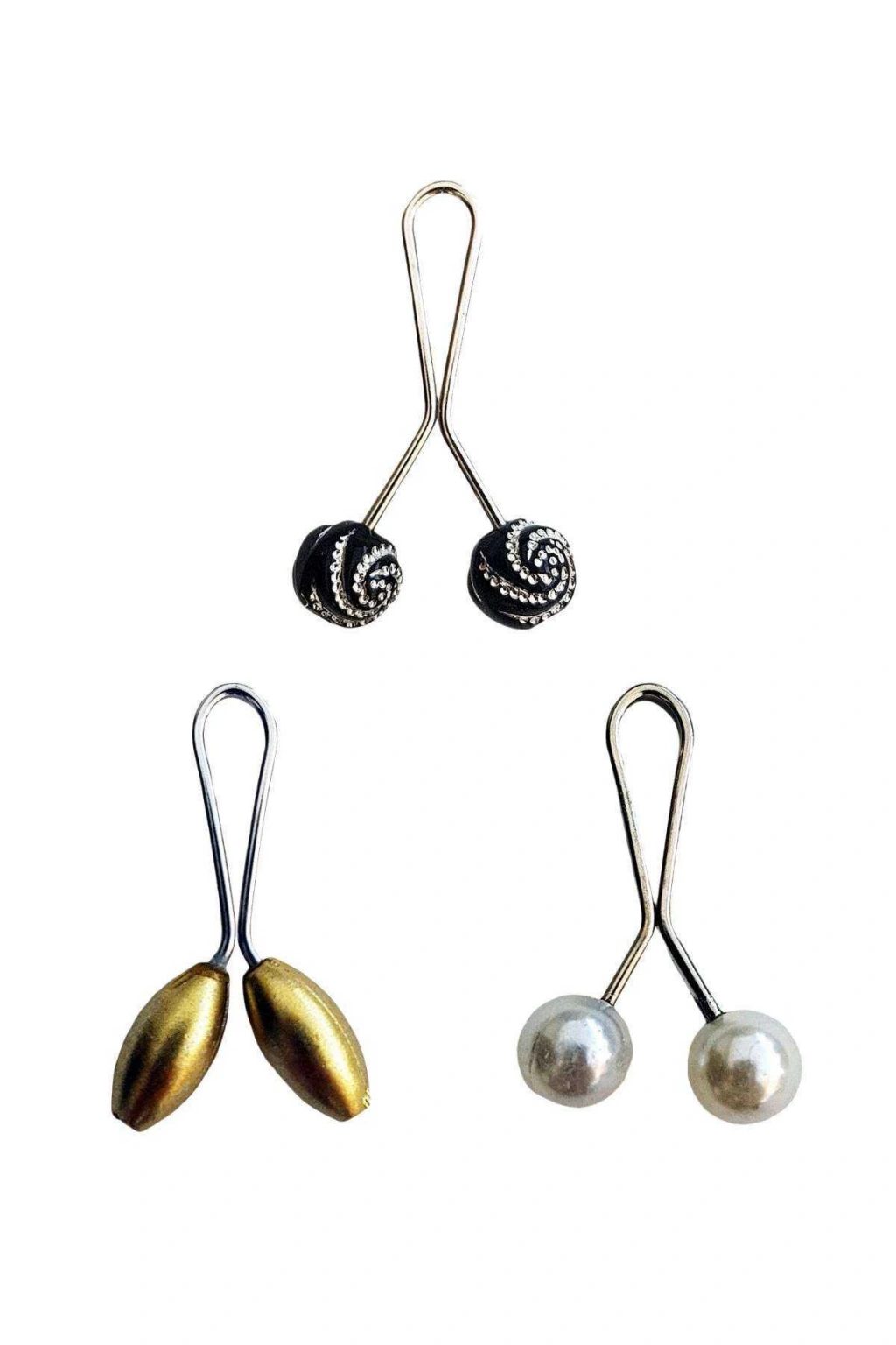 3 Adet Tesettür Eşarp ve Şal Klipsi Sarı İnci Beyaz Siyah Desenli