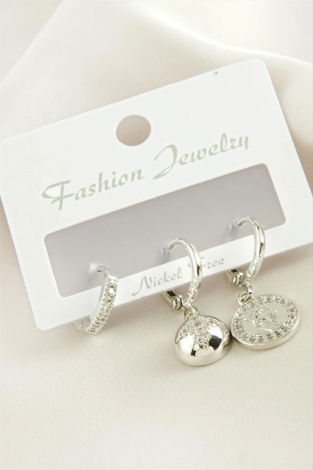 Küpe; Ürün malzemesi metal ve zirkon taşından imal edilmiştir. 1 sınıf kaliteli malzeme kullanılmıştır. Ürün boyu 2,5 cmdir. 1 kartta 3 adet küpe bulunmaktadır.