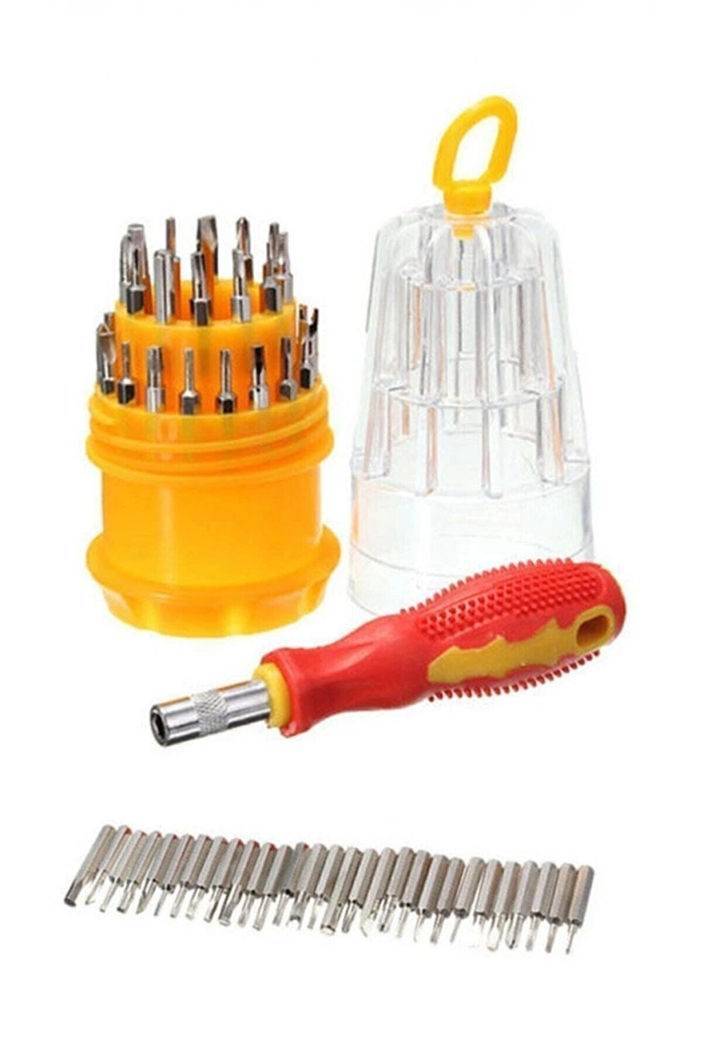 Telefon Elektronik Tamir Tornavida Seti 003 Özellikle cep telefonu ve elektronik alet tamiratlarında gerekli olan bu set ile tüm vidalama işlemlerini rahatlıkla yapabilirsiniz. Özel yer kaplamaz taşıma haznesi ile bir çok yere rahatlıkla sığdırabilirsiniz. Ayrıca evinizdeki birçok vidalama işi içinde uygundur. Dar alanlarda bile vidalama imkanı. Mıknatıslı gövde. Tornavida uzunluğu : 10cm. Özellikler : 31 Parça yıldız tornavida alyan Tornavida uzunluğu 10cm Muhafaza kutusu Paket İçeriği : 1 adet: Tutucu Kol 4 adet: Yıldız Tornavida -PH00-PHO-PH1-PH2 9 adet: Tork Tornavida - T3-T4-T5-T6-T7-T8-T10-T15-T20 5 adet: Düz Tornavida - 1.5-2-2.5-3-3.5 7 adet :Alyan uç 5 adet :Çeşitli uç -çatal uç-delikli uç-gibi 1 adet :Taşıma çantası plastik