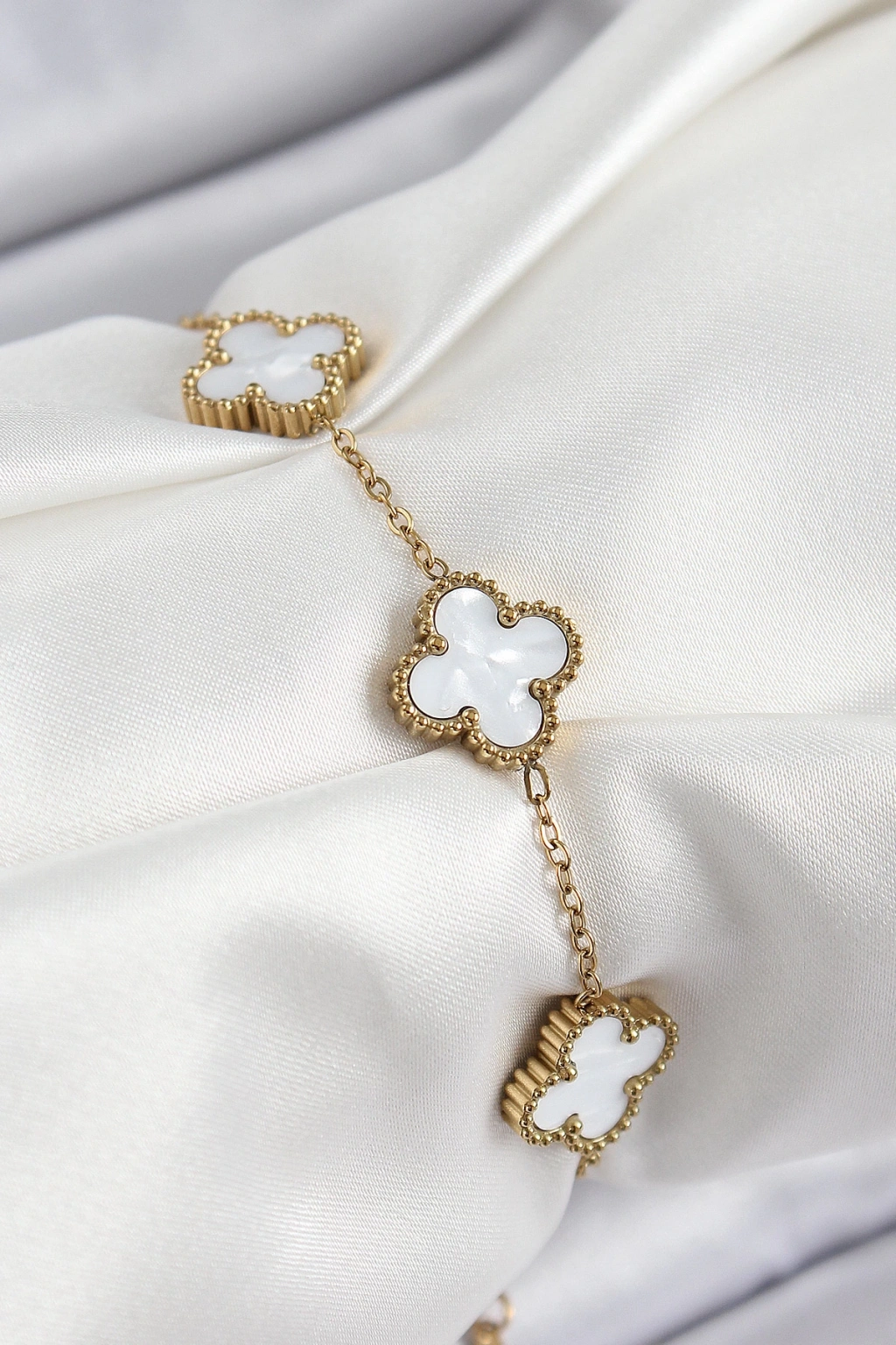 316L Çelik Beyaz Sedef Yonca Model Gold Renk Kadın Bileklik - TJ-BB7364