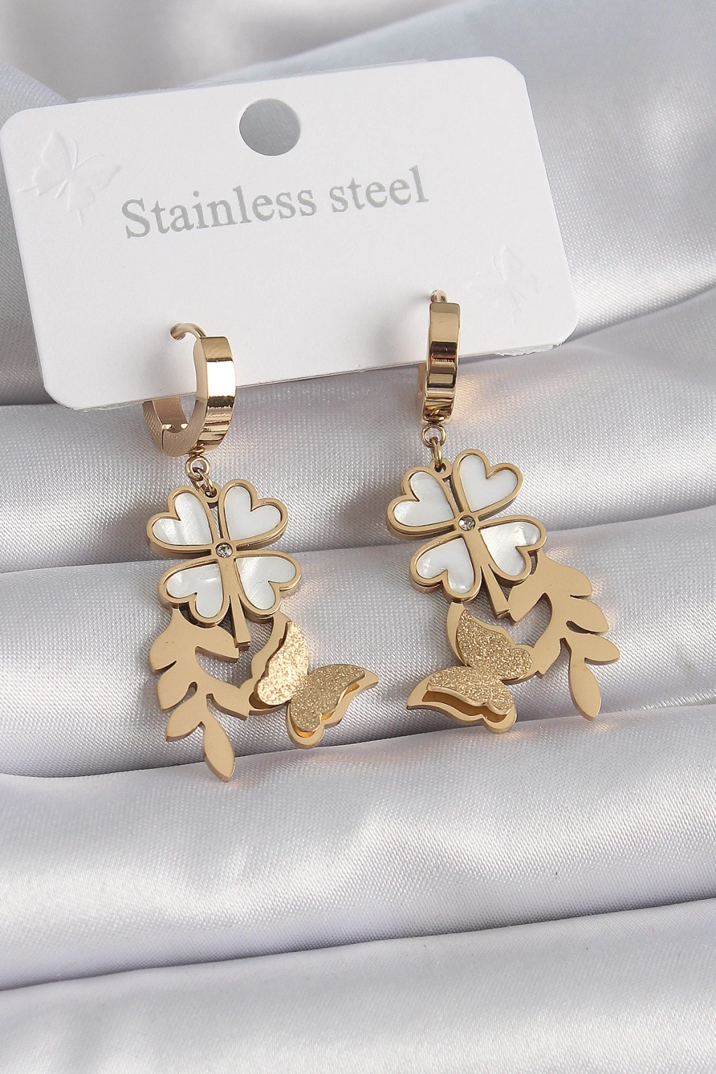 316L Çelik Gold Renk Beyaz Sedefli Yonca Simli Kelebek Figür Kadın Küpe - TJ-BKP9566