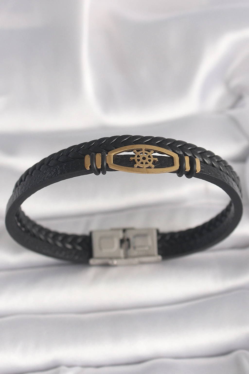 316L Çelik Gold Renk Gemi Dümen Figür Siyah Renk Çift Sıra Burgu Desenli Deri Kordon Erkek Bileklik - TJ-EB3706