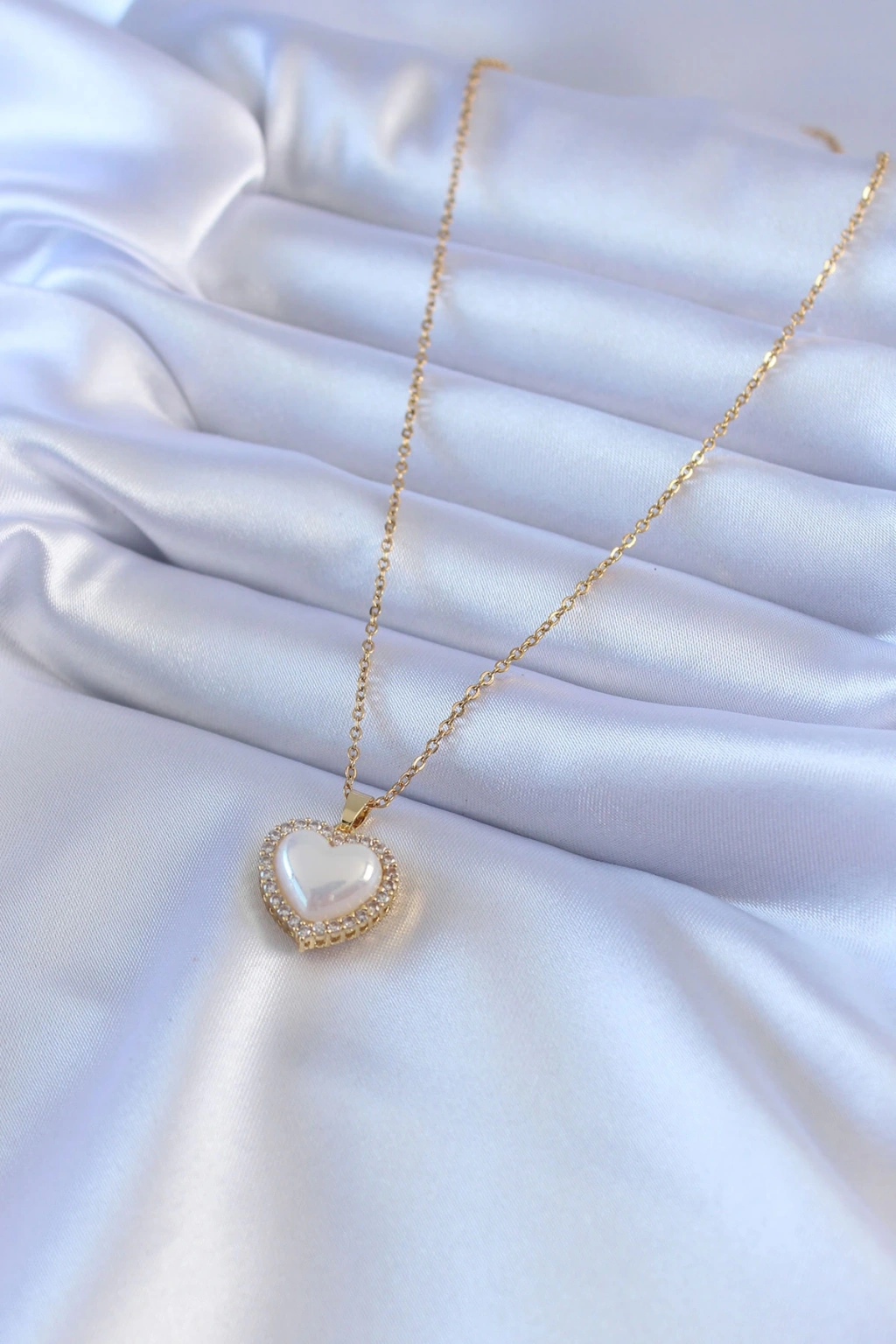 316L Çelik Gold Renk İncili Kalp Model Zirkon Taşlı Kadın Kolye - TJ-BKO7566