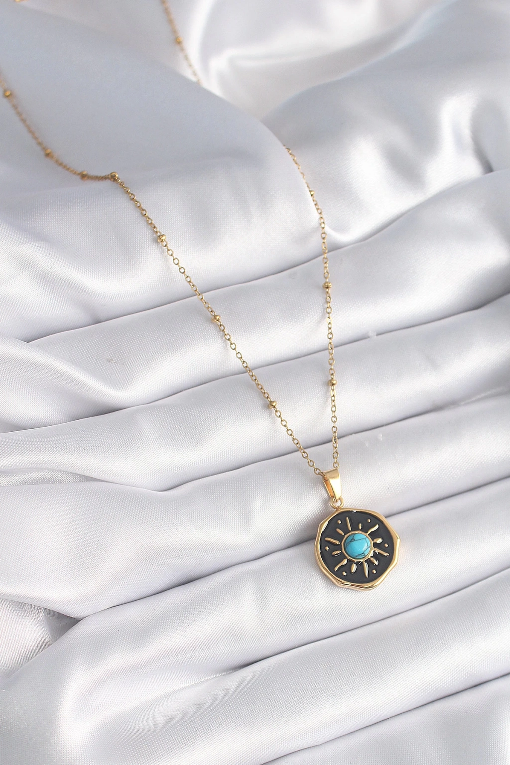 316L Çelik Gold Renk Mavi Boncuk Güneş İşleme Madalyon Model Kadın Kolye - TJ-BKO9524
