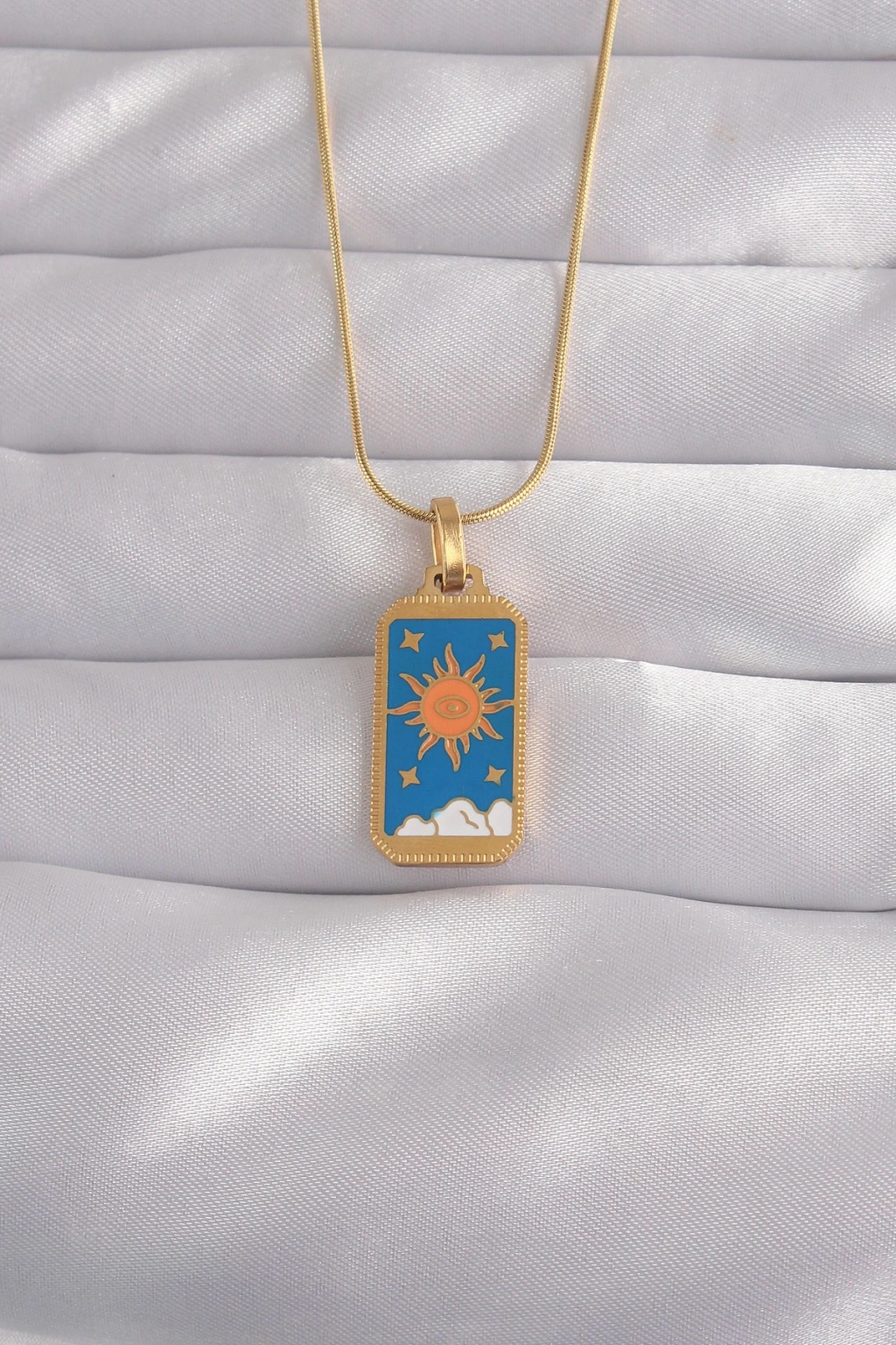 316L Çelik Gold Renk Mavi Mineli Güneş Model Tarot Kolye - TJ-BKO9026