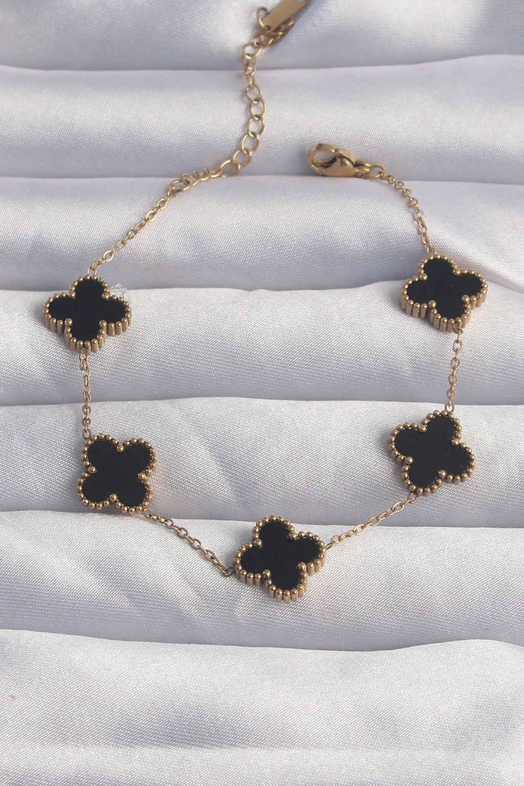 316L Çelik Gold Renk Siyah Mineli Yonca Bileklik - TJ-BB6258
