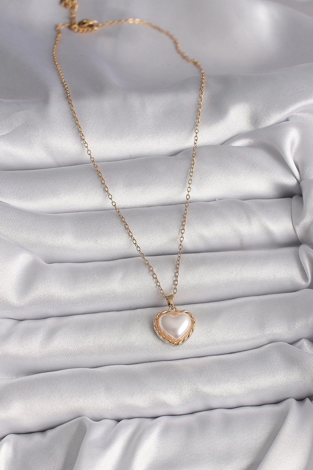 316L Çelik Gold Renk Zincir 3D İnci Kalp Model Kadın Kolye - TJ-BKO9713