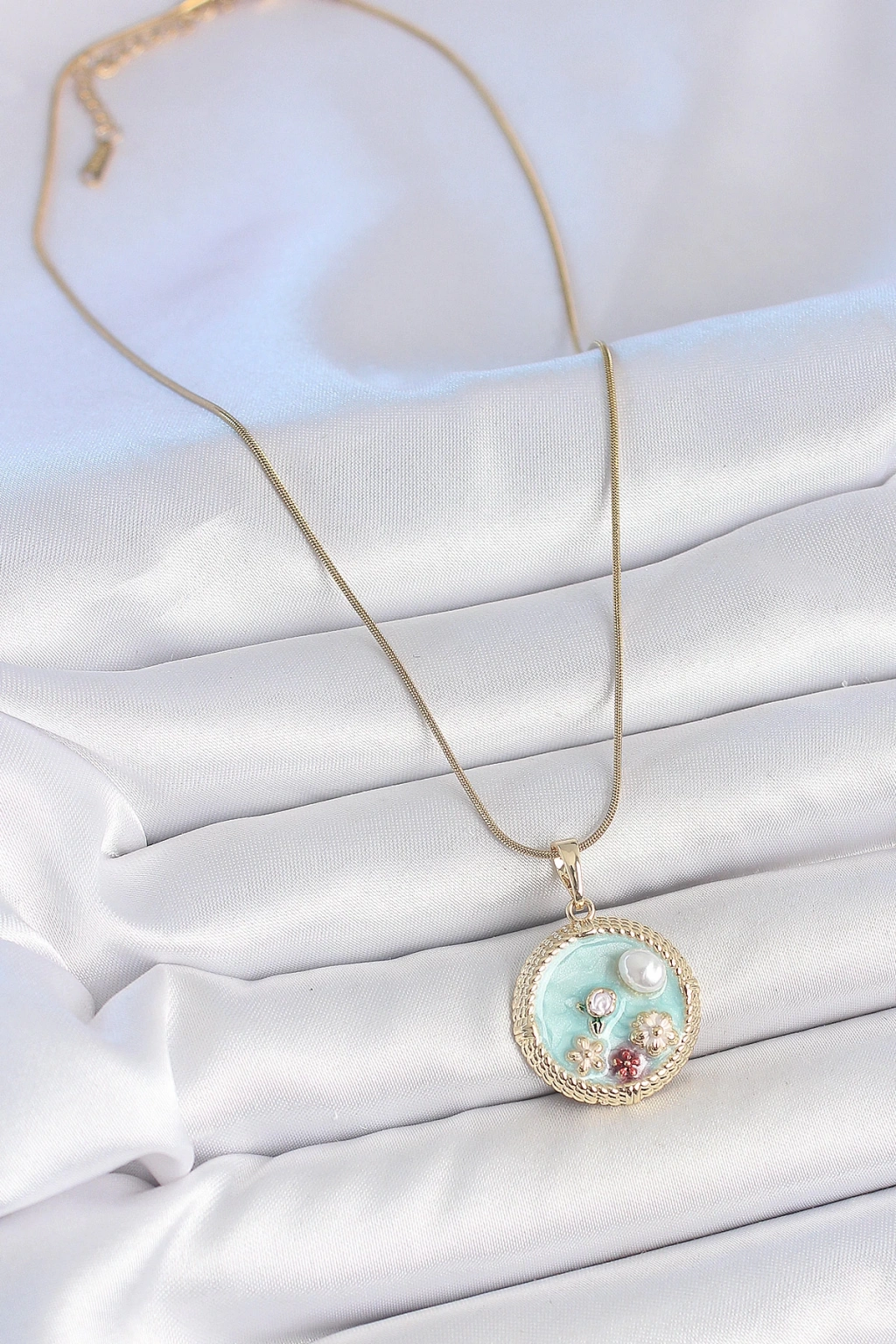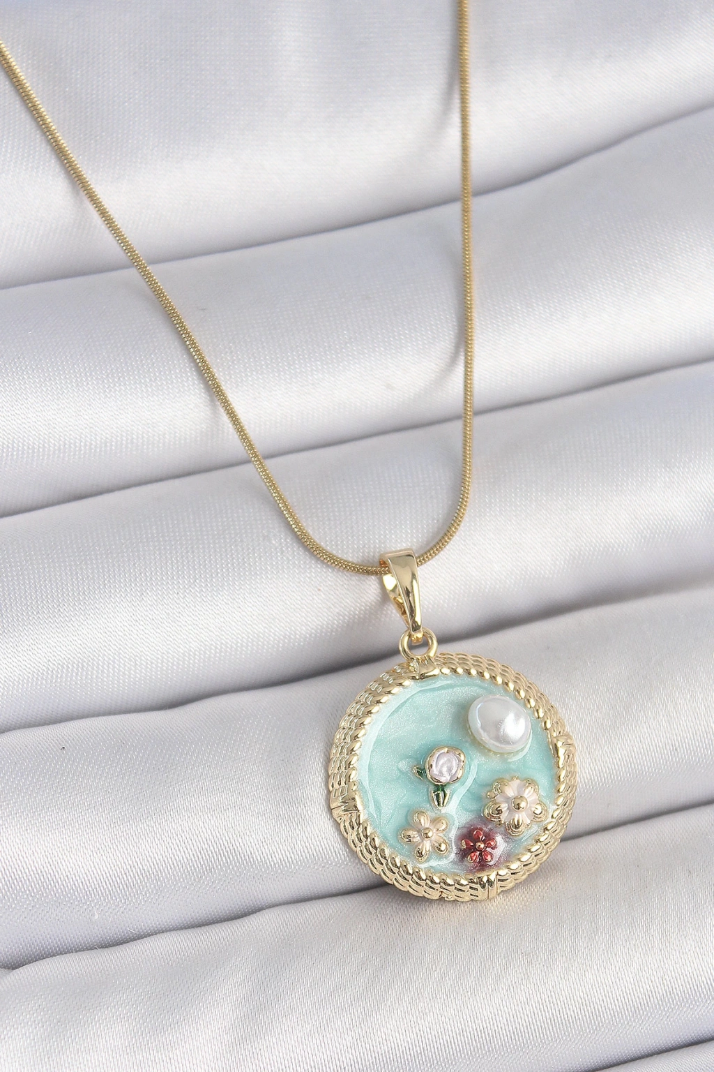 316L Çelik Gold Renk Zincir Mavi Mineli İnci Çiçek İşlemeli Zirkon Taş Detaylı Madalyon Model Kadın Kolye - TJ-BKO10174