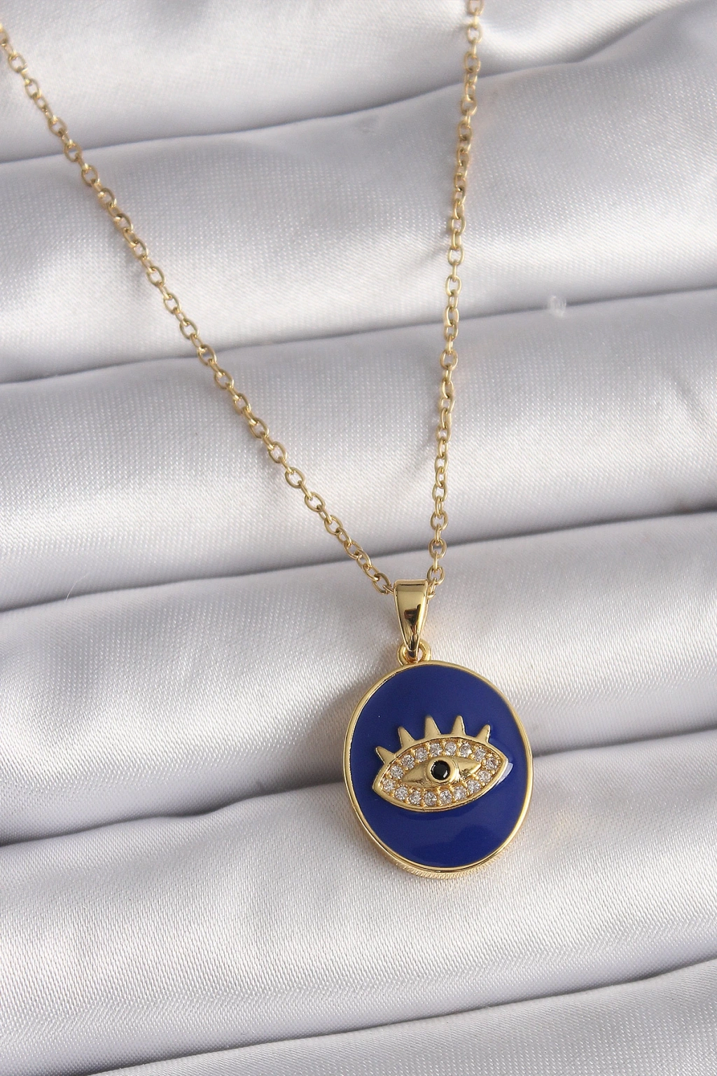 316L Çelik Gold Renk Zincir Mavi Mineli Zirkon Taşlı Göz İşleme Kadın Kolye - TJ-BKO9505