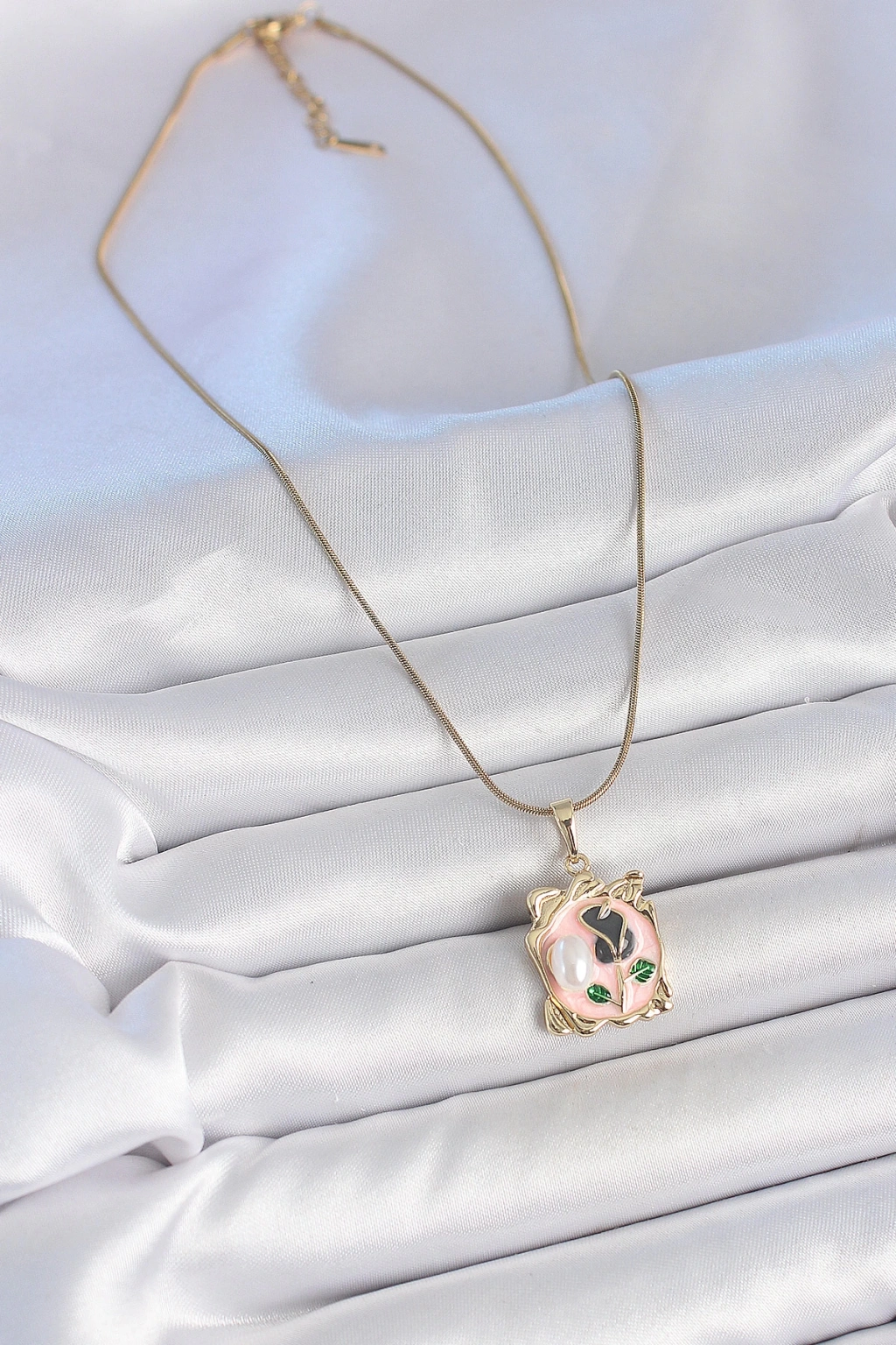 316L Çelik Gold Renk Zincir Pembe Mineli Çiçek İşlemli İnci Detay Portre Model Kadın Kolye - TJ-BKO10185
