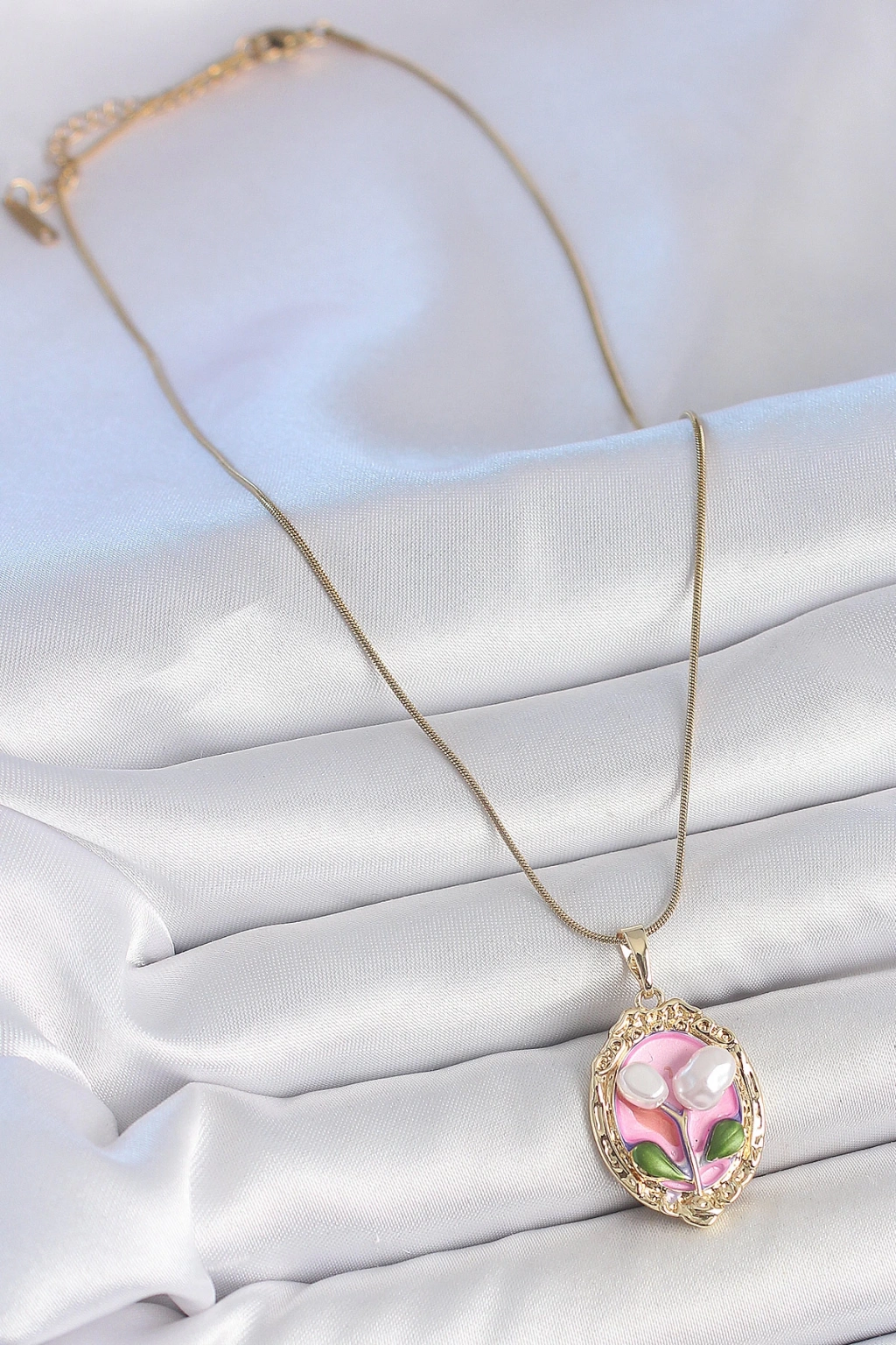 316L Çelik Gold Renk Zincir Pembe Mineli İncili Çiçek İşlemeli Portre Model Kadın Kolye - TJ-BKO10148