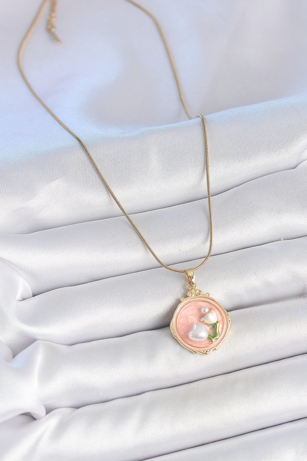 316L Çelik Gold Renk Zincir Pembe Mineli İncili Çiçek İşlemeli Portre Model Kadın Kolye - TJ-BKO10151
