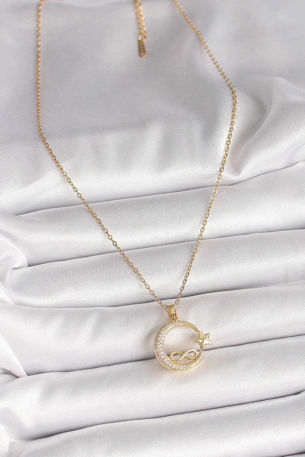 316L Çelik Gold Renk Zincir Zirkon Taşlı Ay Yıldız Model Sonsuzluk Detay Kadın Kolye - TJ-BKO10000