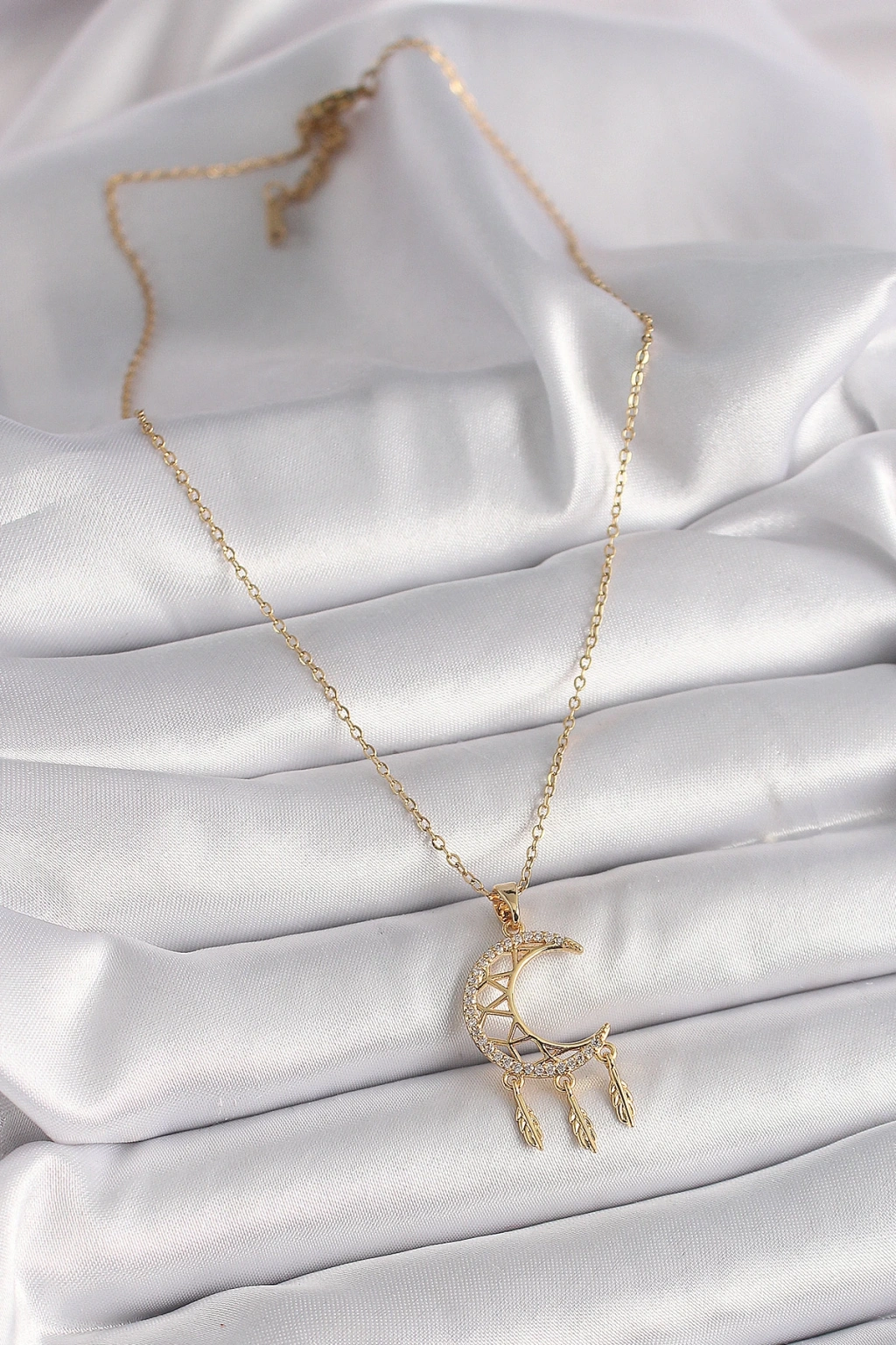 316L Çelik Gold Renk Zincir Zirkon Taşlı Hilal Model Sallantı Yaprak Detay Kadın Kolye - TJ-BKO9650
