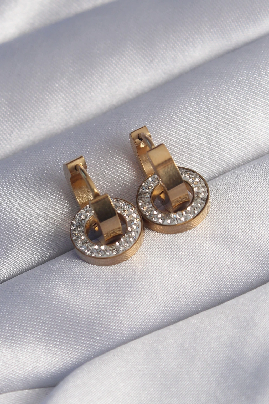 316L Çelik Gold Renk Zirkon Taşlı İç İçe Geçmeli Oval Küpe - TJ-BKP9014