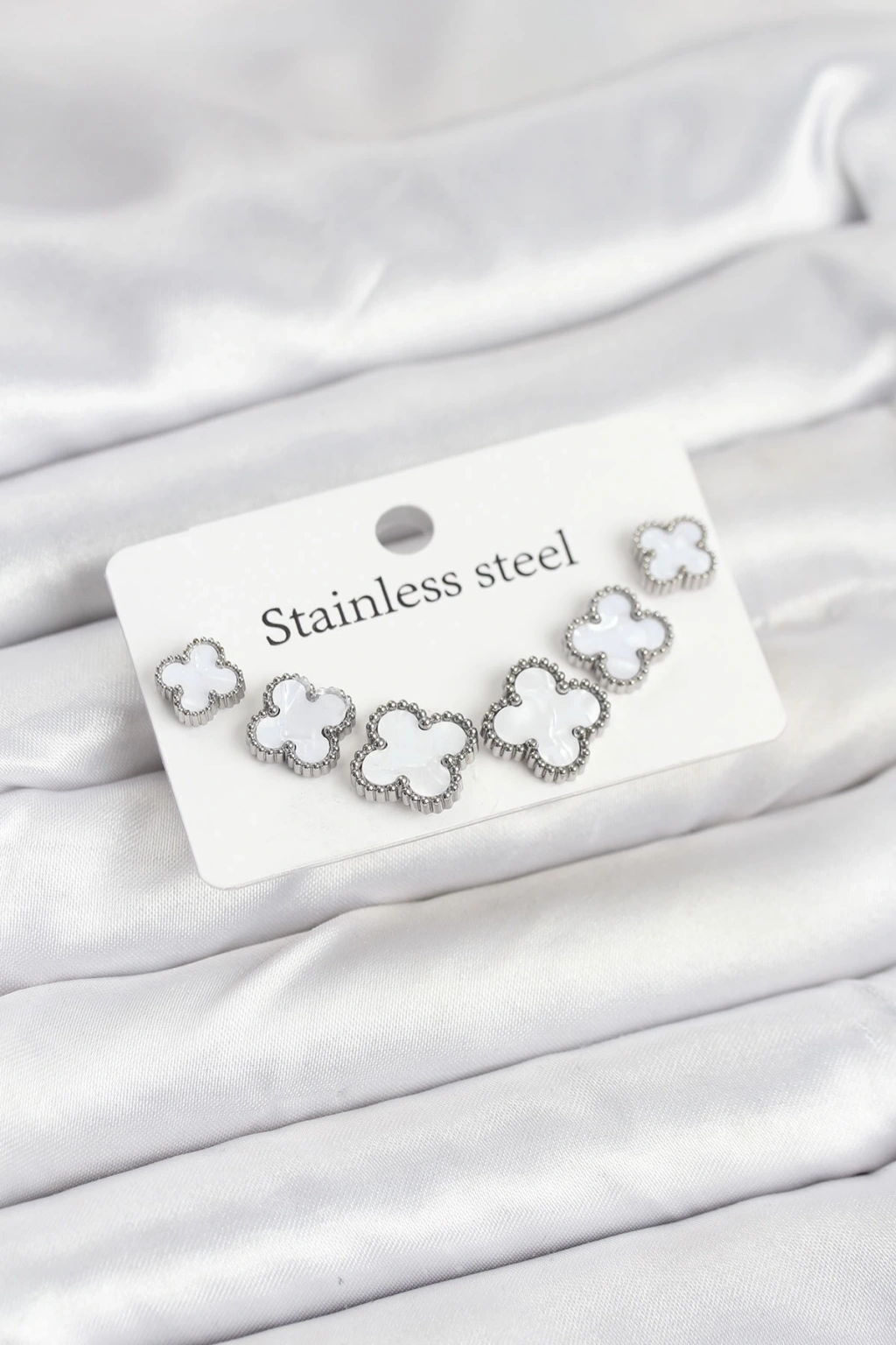 316L Çelik Gümüş Beyaz Renk 3 Boy Yonca Küpe Seti - TJ-BKP11236