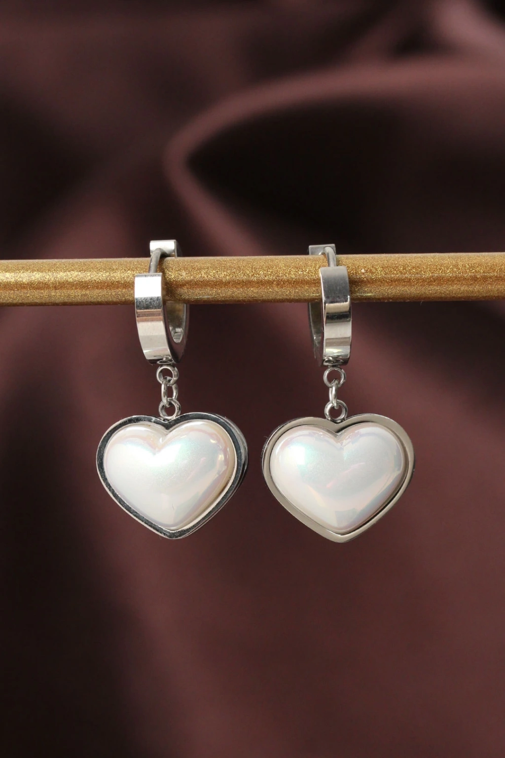 316L Çelik Gümüş Renk Beyaz Bombeli Kalp Küpe - TJ-BKP6316