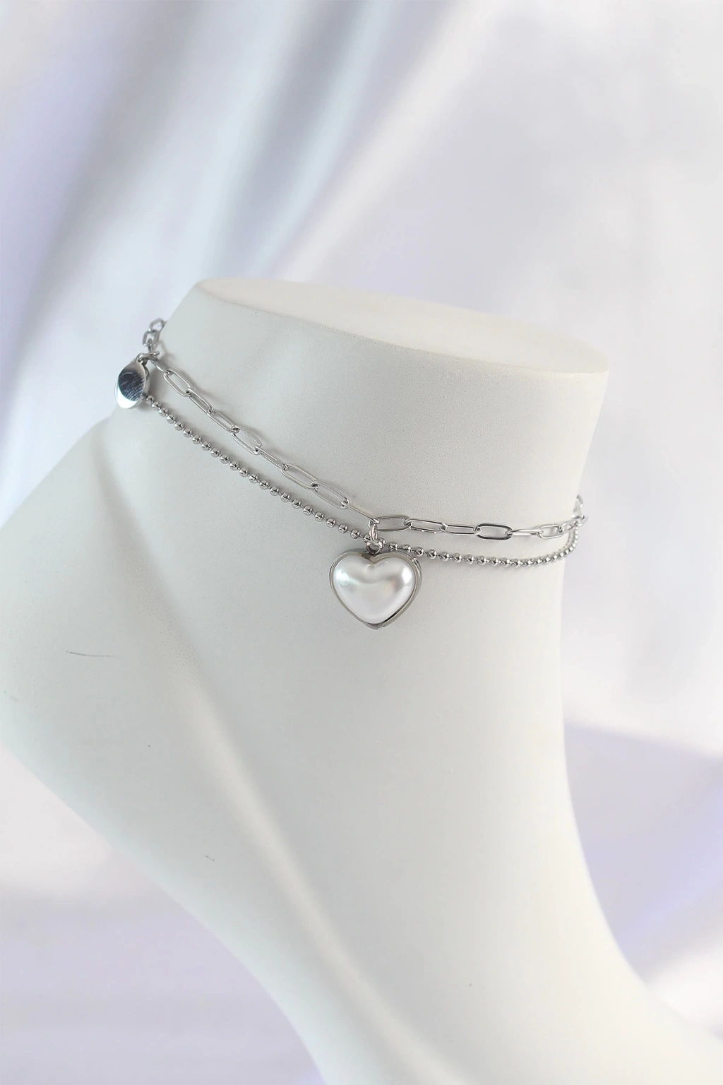 316L Çelik Gümüş Renk Beyaz Kalpli 2li Halhal - TJ-HH1585