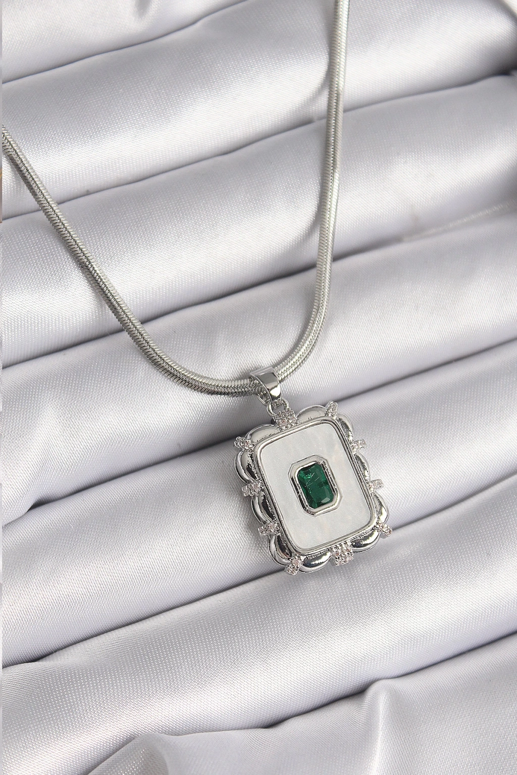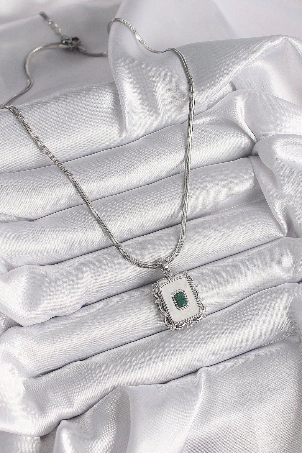 316L Çelik Gümüş Renk İtalyan Zincir Beyaz Sedefli Kare Portre Model Zümrüt Taş Detay Kadın Kolye - TJ-BKO9596