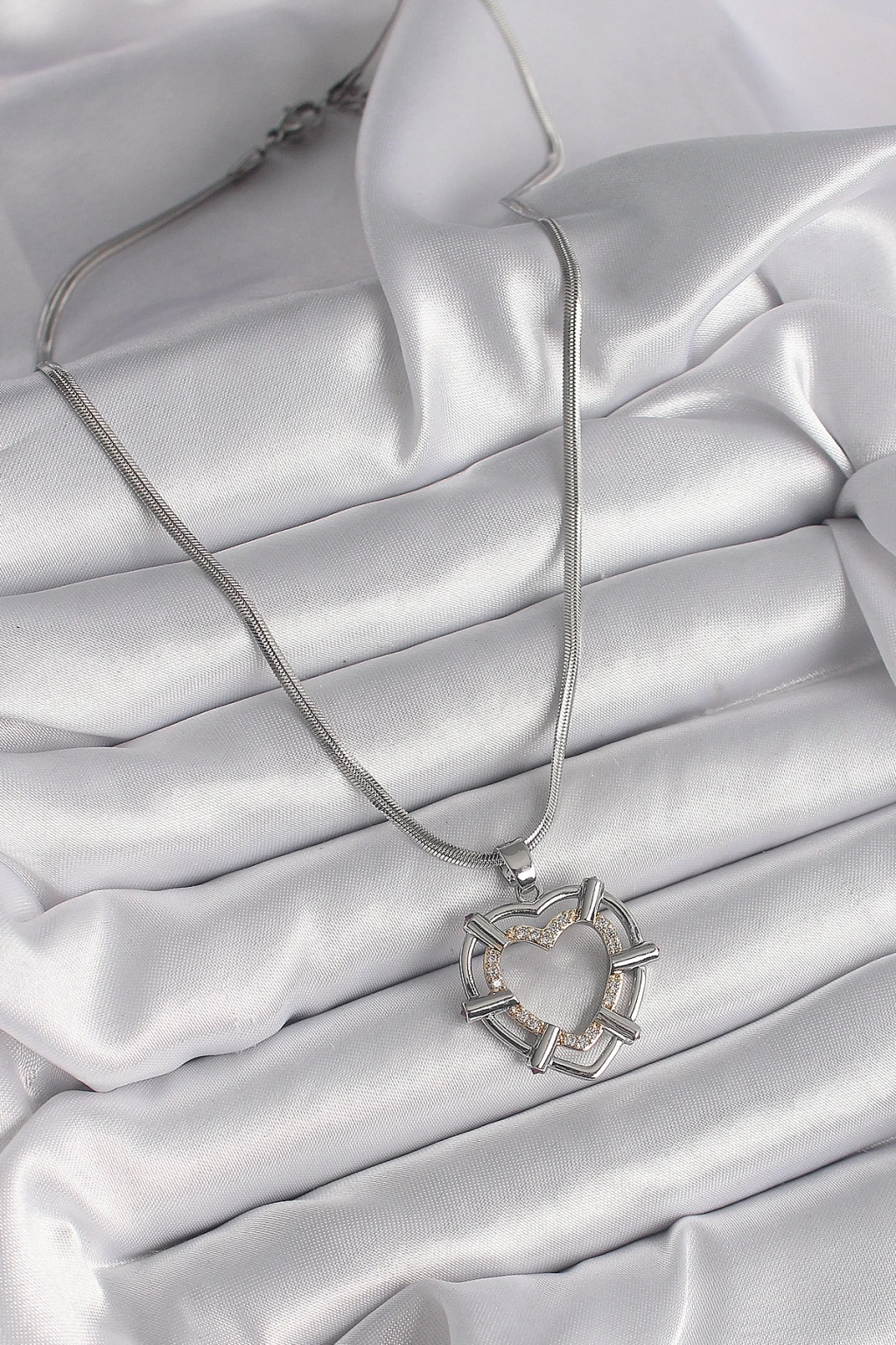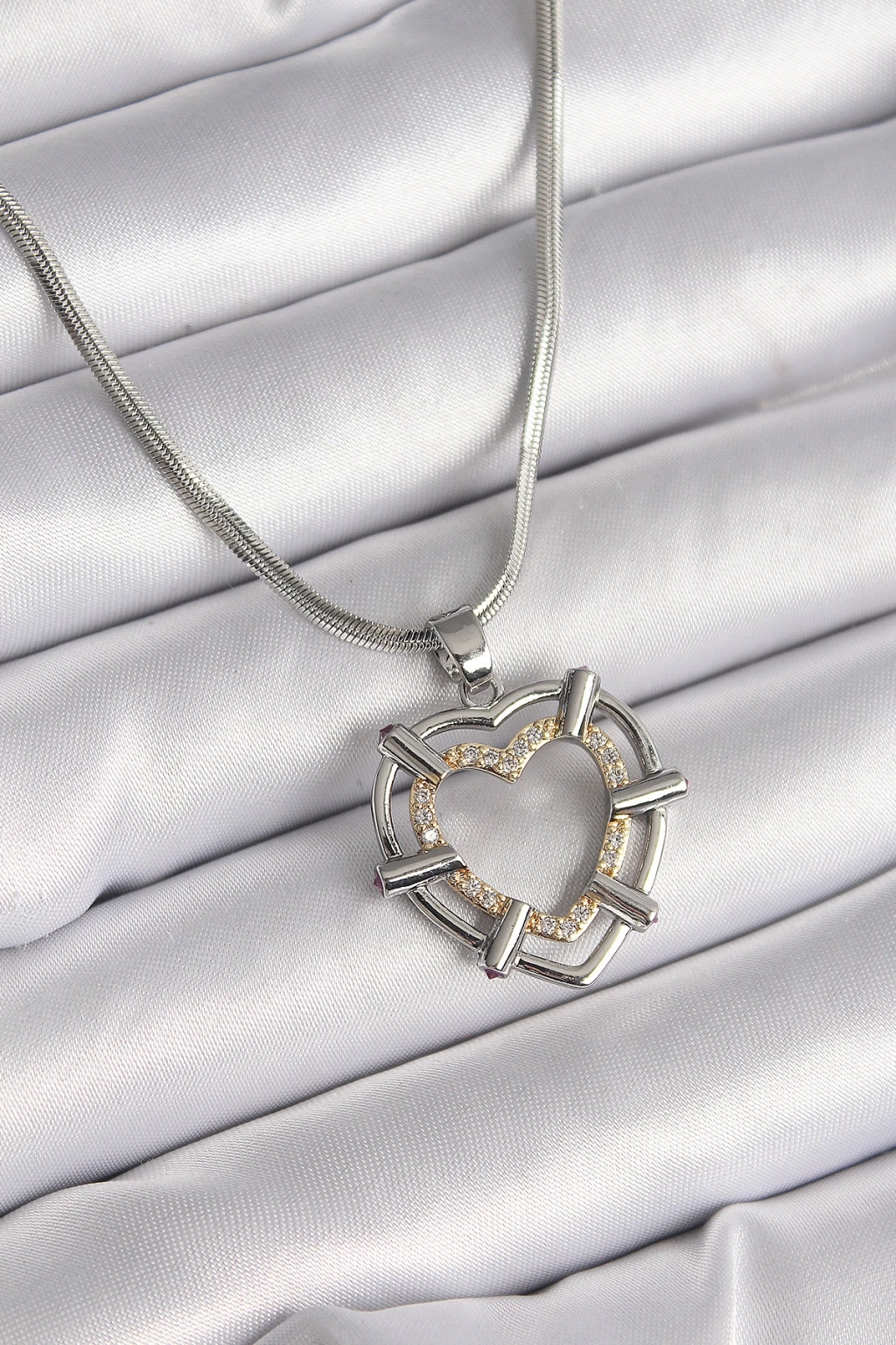 316L Çelik Gümüş Renk İtalyan Zincir Mix Renk Zirkon Taş Detay Kalp Model Kadın Kolye - TJ-BKO9600