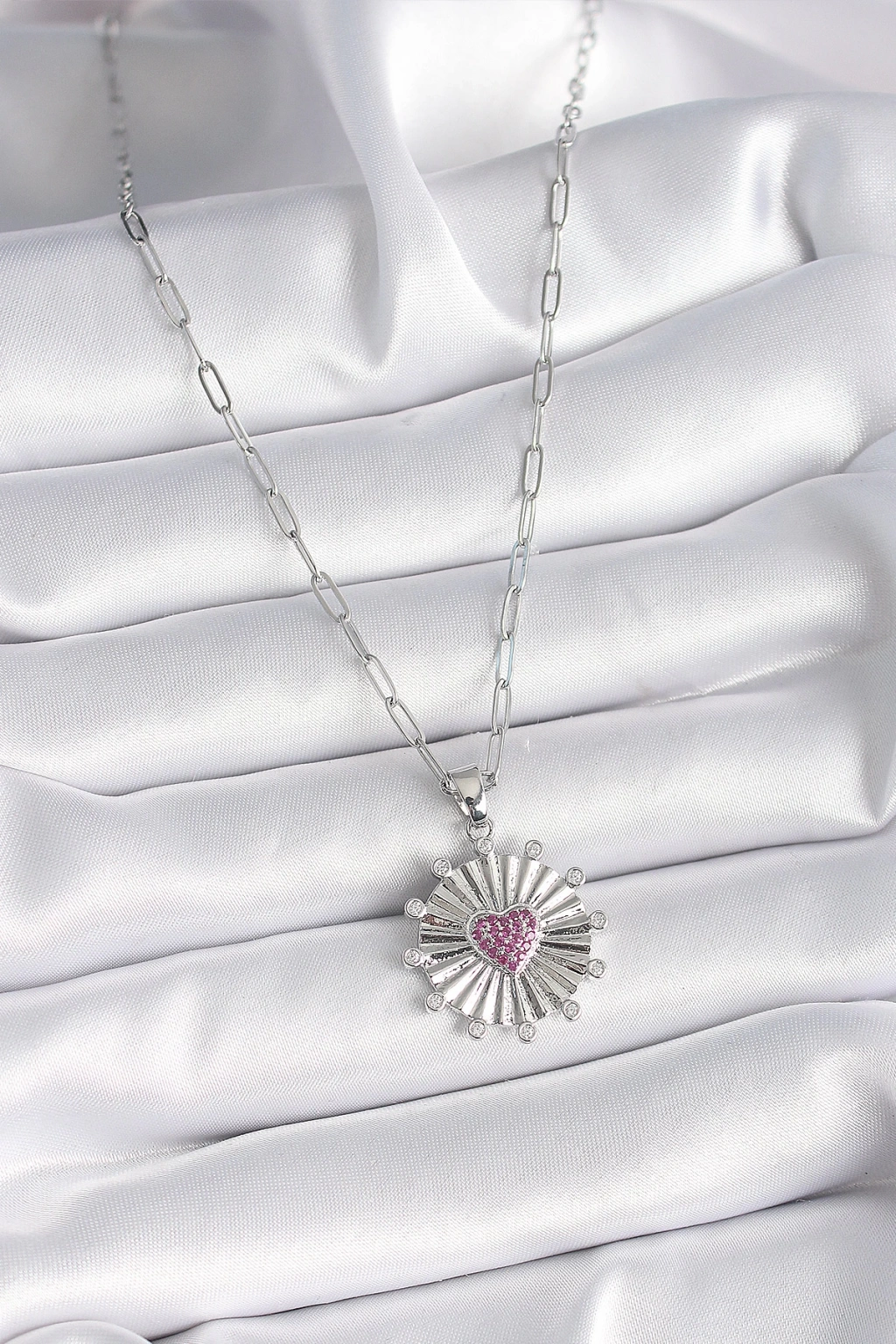 316L Çelik Gümüş Renk Pembe Zirkon Taşlı Kalp İşleme Madalyon Model Kadın Kolye - TJ-BKO9533