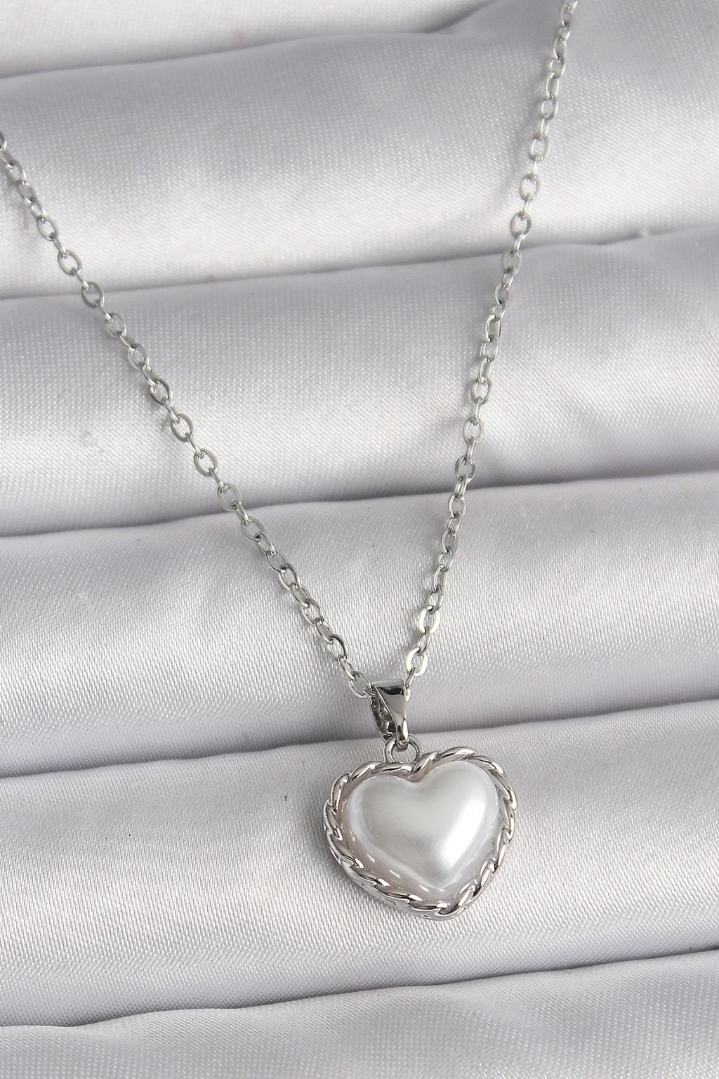 316L Çelik Gümüş Renk Zincir 3D İnci Kalp Model Kadın Kolye - TJ-BKO9712