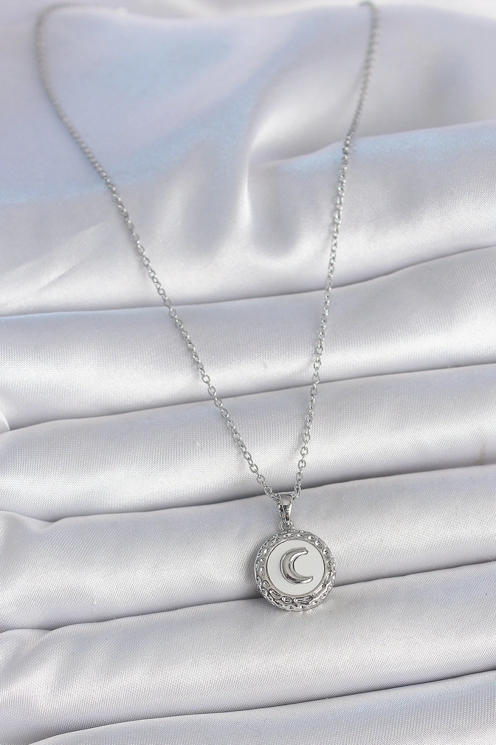 316L Çelik Gümüş Renk Zincir Beyaz Mineli Hilal İşlemeli Madalyon Model Kadın Kolye - TJ-BKO10034