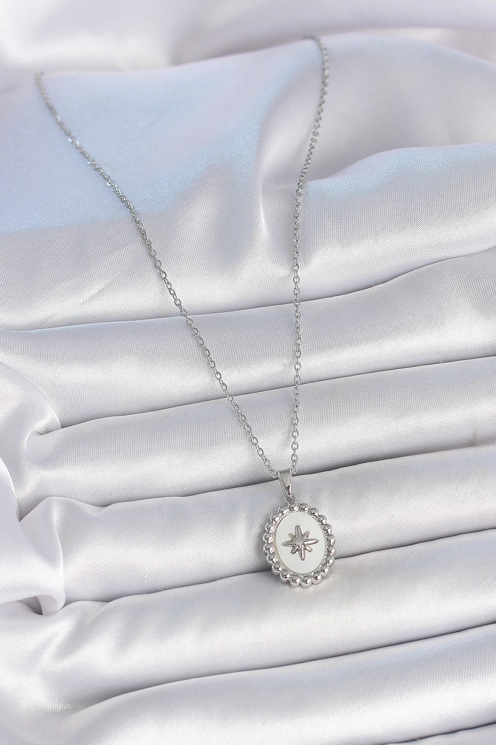 316L Çelik Gümüş Renk Zincir Beyaz Mineli Kutup Yıldız İşlemeli Madalyon Model Kadın Kolye - TJ-BKO10062