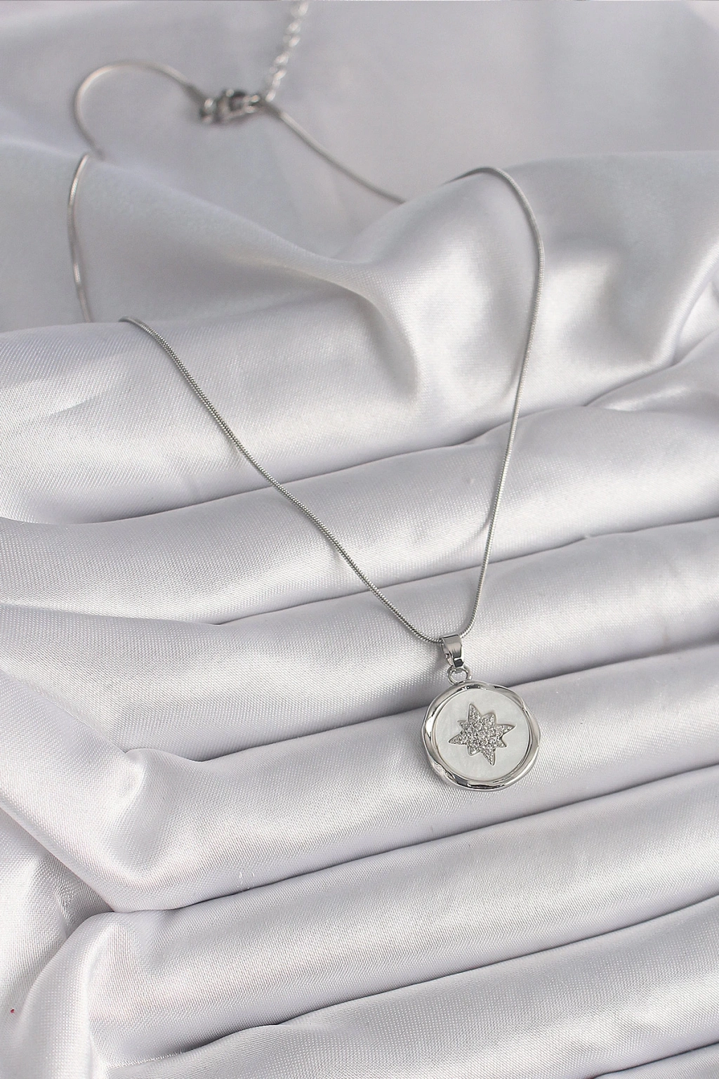 316L Çelik Gümüş Renk Zincir Beyaz Sedefli Zirkon Taşlı Yıldız İşleme Model Kadın Kolye - TJ-BKO9635
