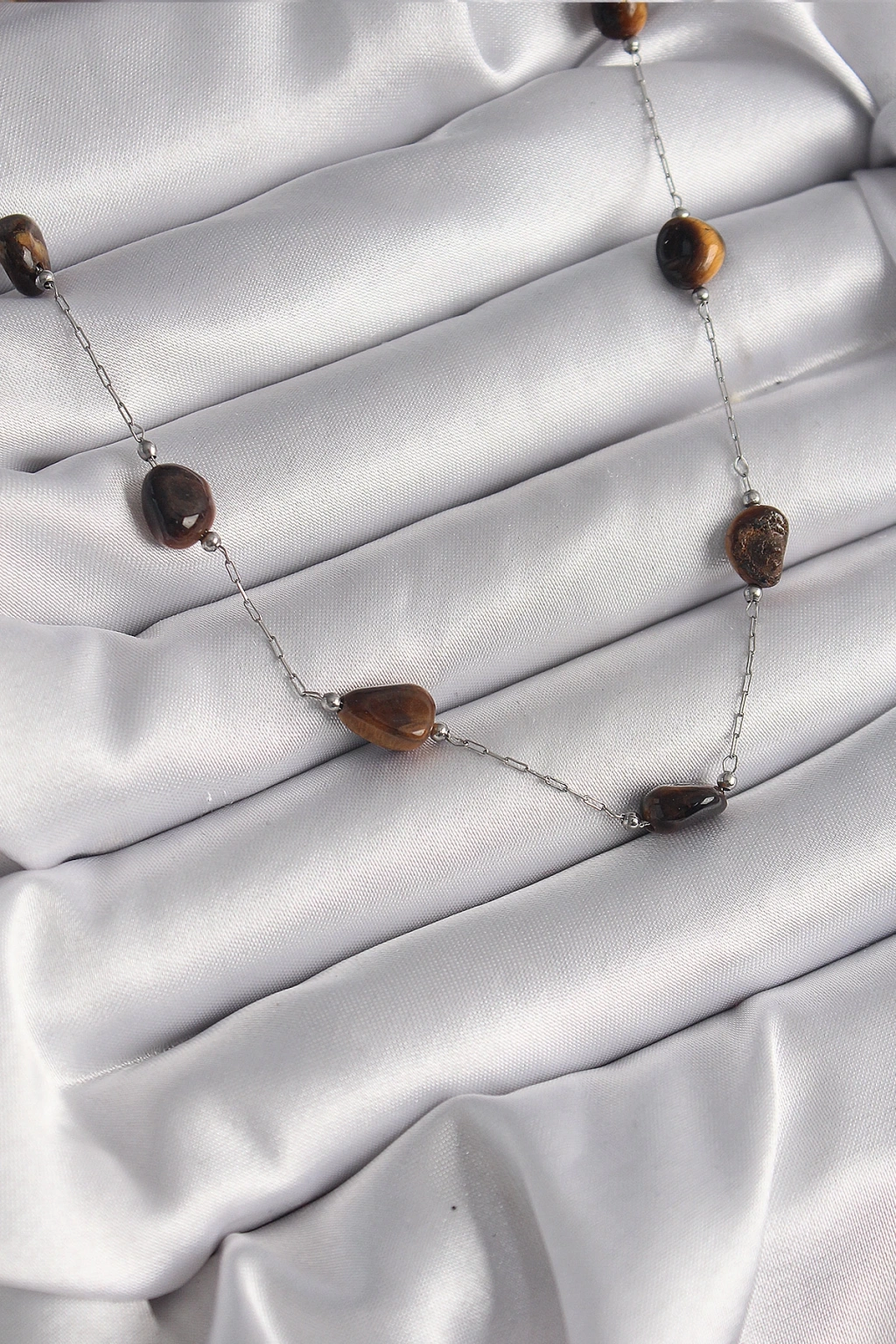 316L Çelik Gümüş Renk Zincir Kahverengi Doğaltaş Model Kadın Kolye - TJ-BKO9662