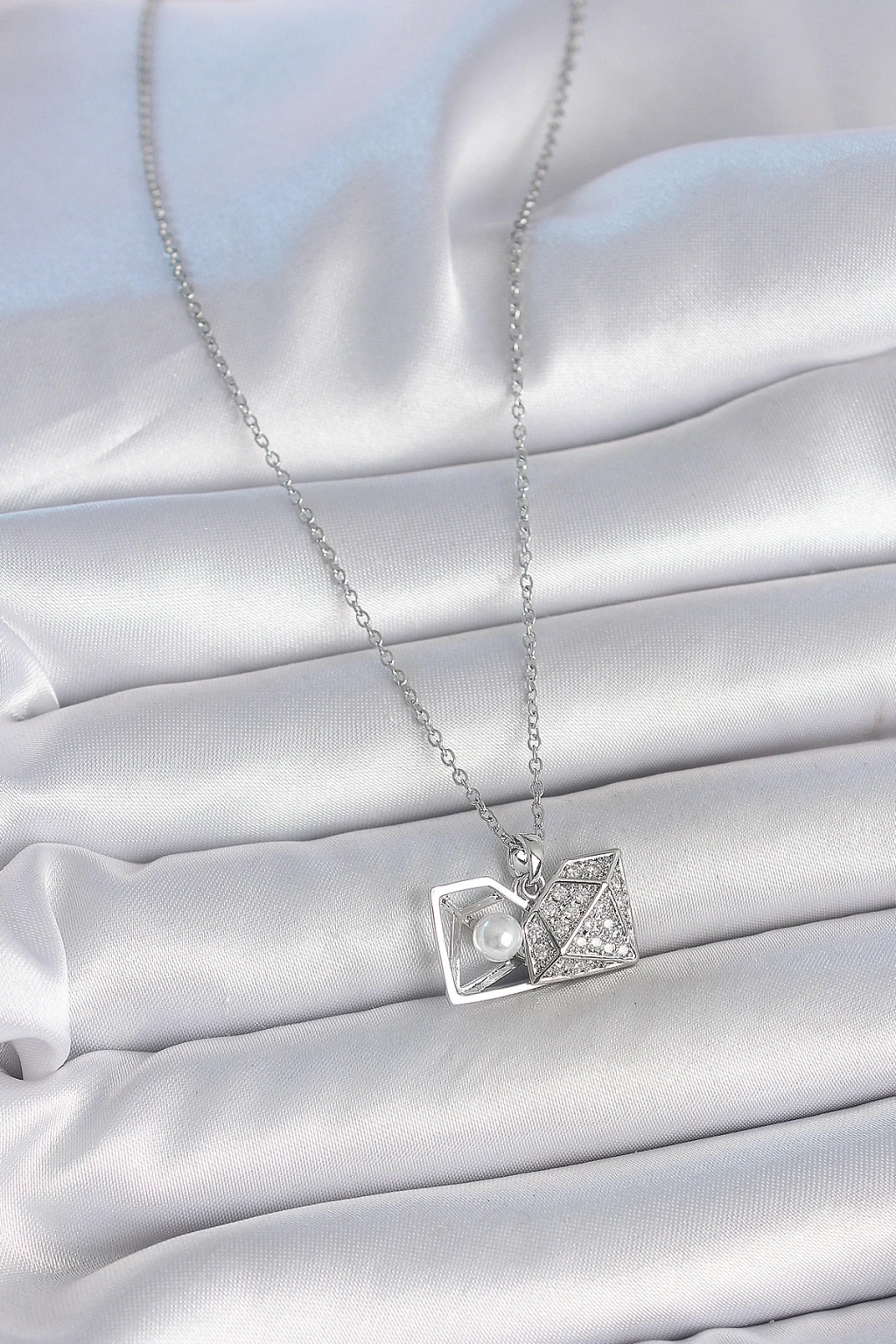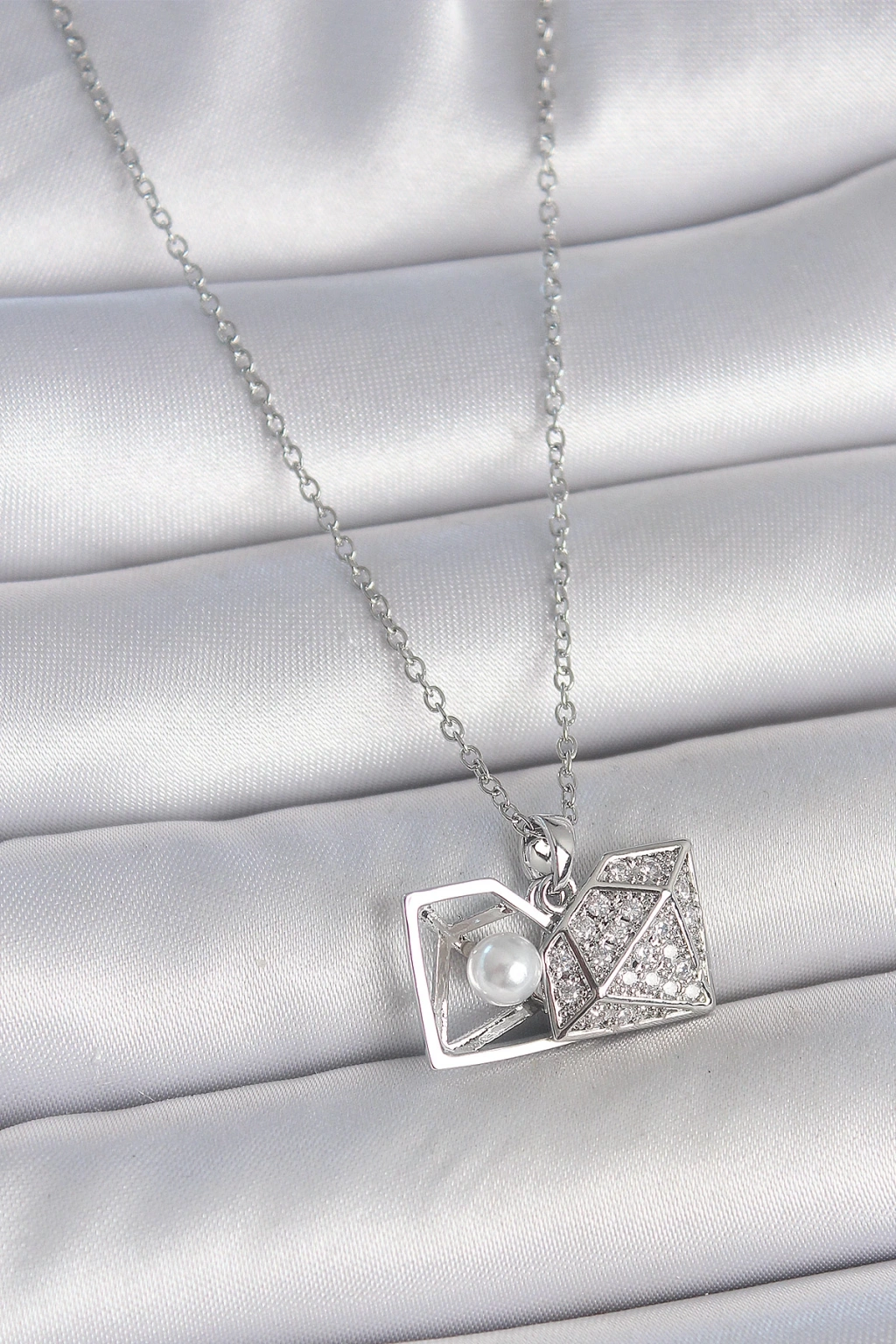 316L Çelik Gümüş Renk Zincir Zirkon Taşlı İncili Açılır Elmas Model Kadın Kolye - TJ-BKO10048