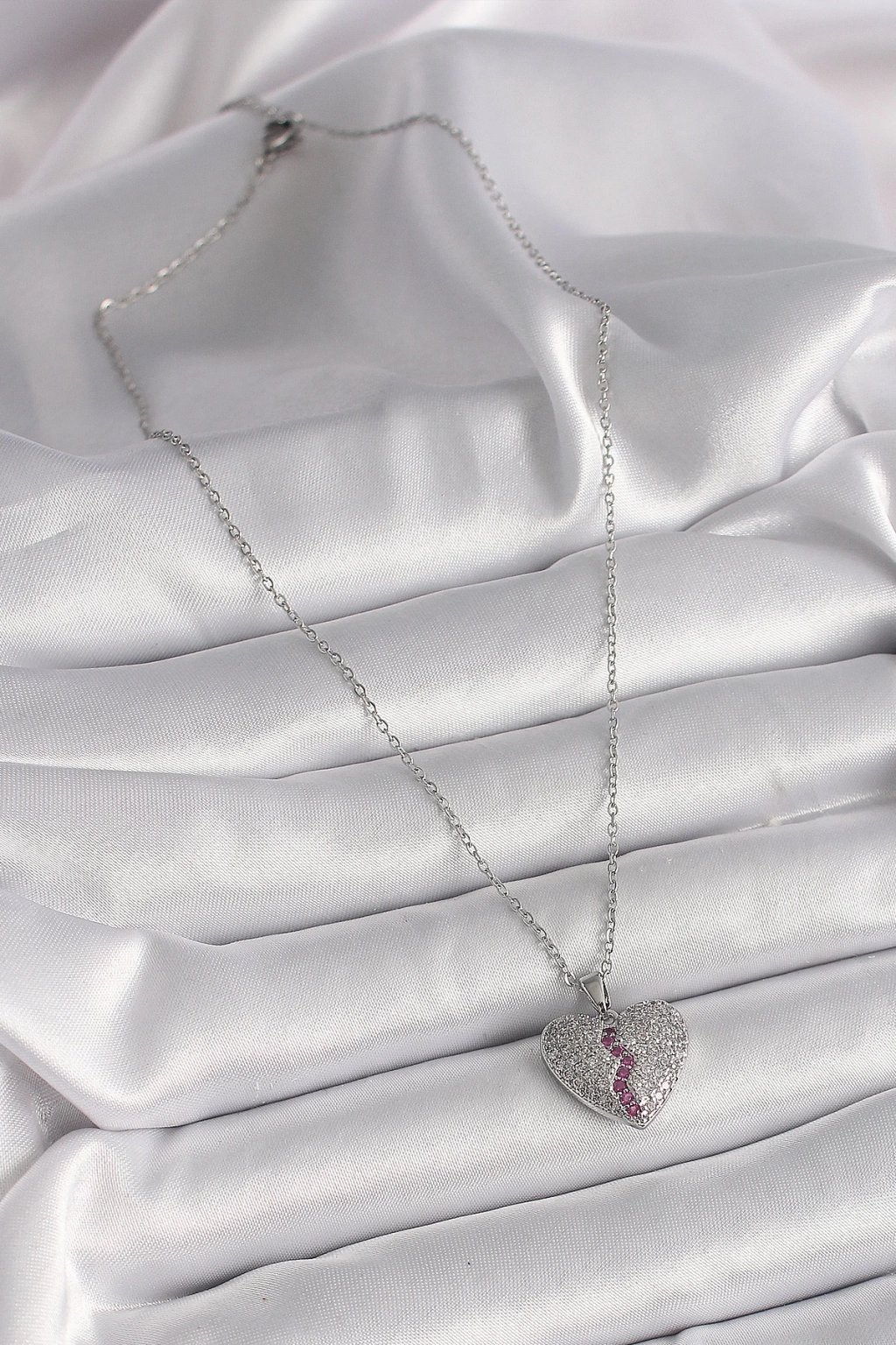 316L Çelik Gümüş Renk Zincir Zirkon Taşlı Kalp Model Kadın Kolye - TJ-BKO9645