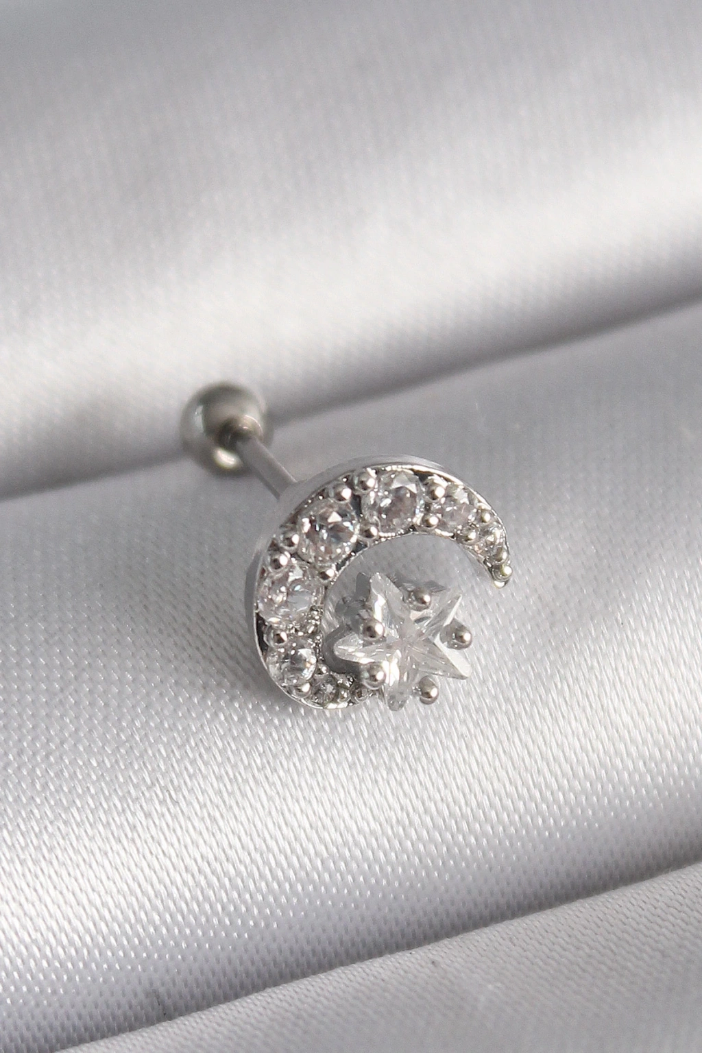 316L Çelik Gümüş Renk Zirkon Taşlı Ay Yıldız Tragus Piercing - TJ-PR1257
