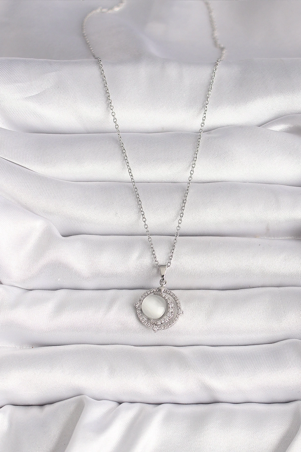 316L Çelik Gümüş Renk Zirkon Taşlı Beyaz Sedefli Hilal Model Kadın Kolye - TJ-BKO9702