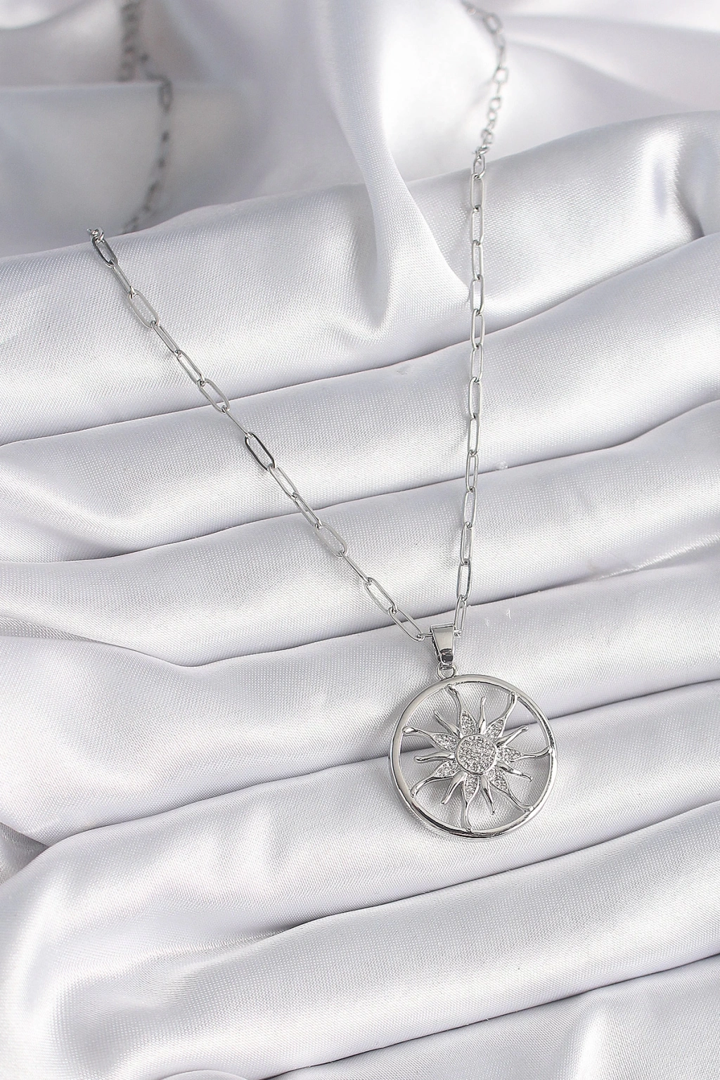 316L Çelik Gümüş Renk Zirkon Taşlı Güneş Madalyon Model Kadın Kolye - TJ-BKO9529