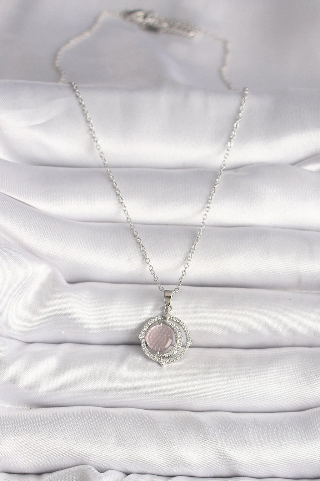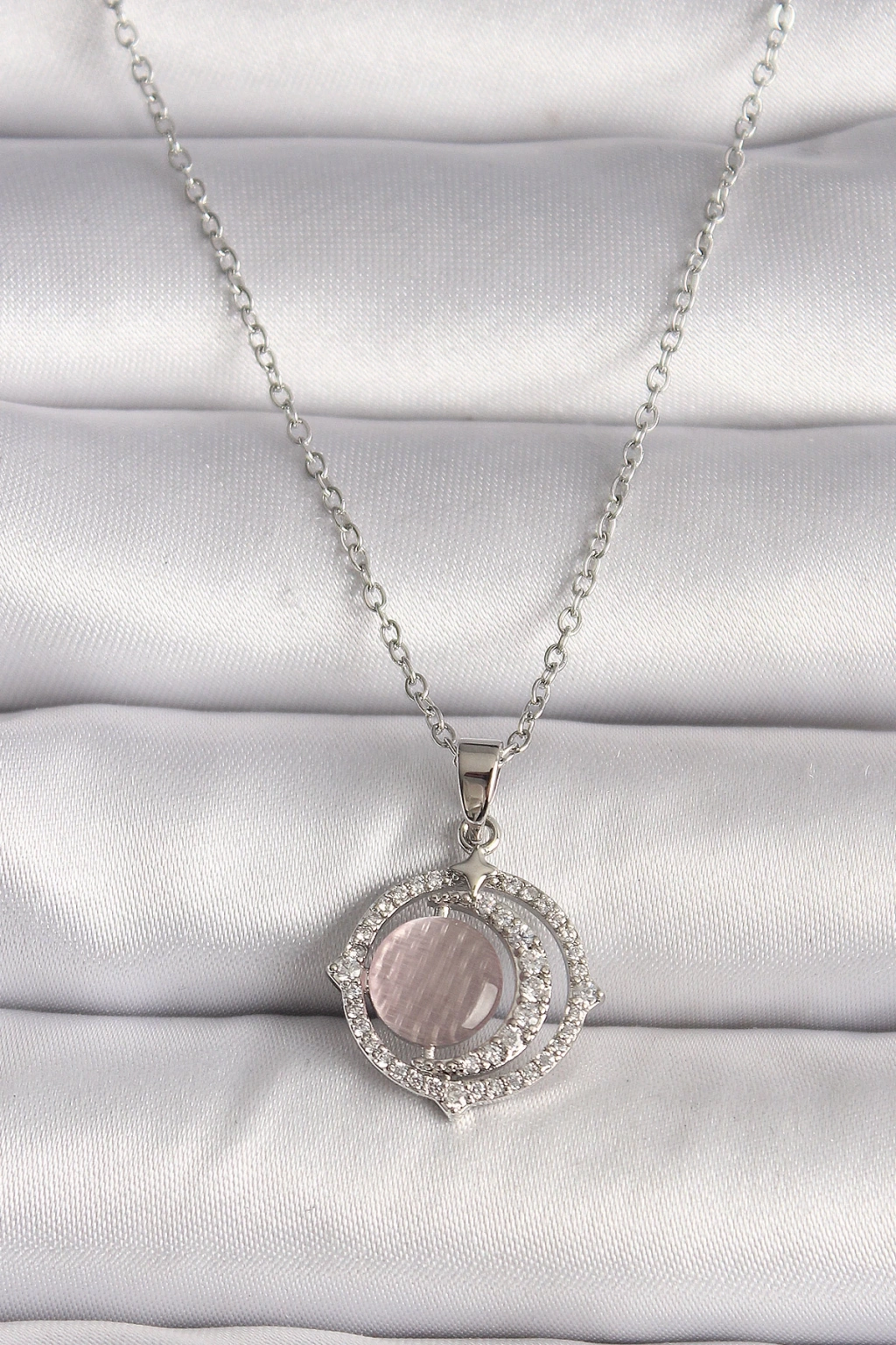 316L Çelik Gümüş Renk Zirkon Taşlı Pembe Sedefli Hilal Model Kadın Kolye - TJ-BKO9701