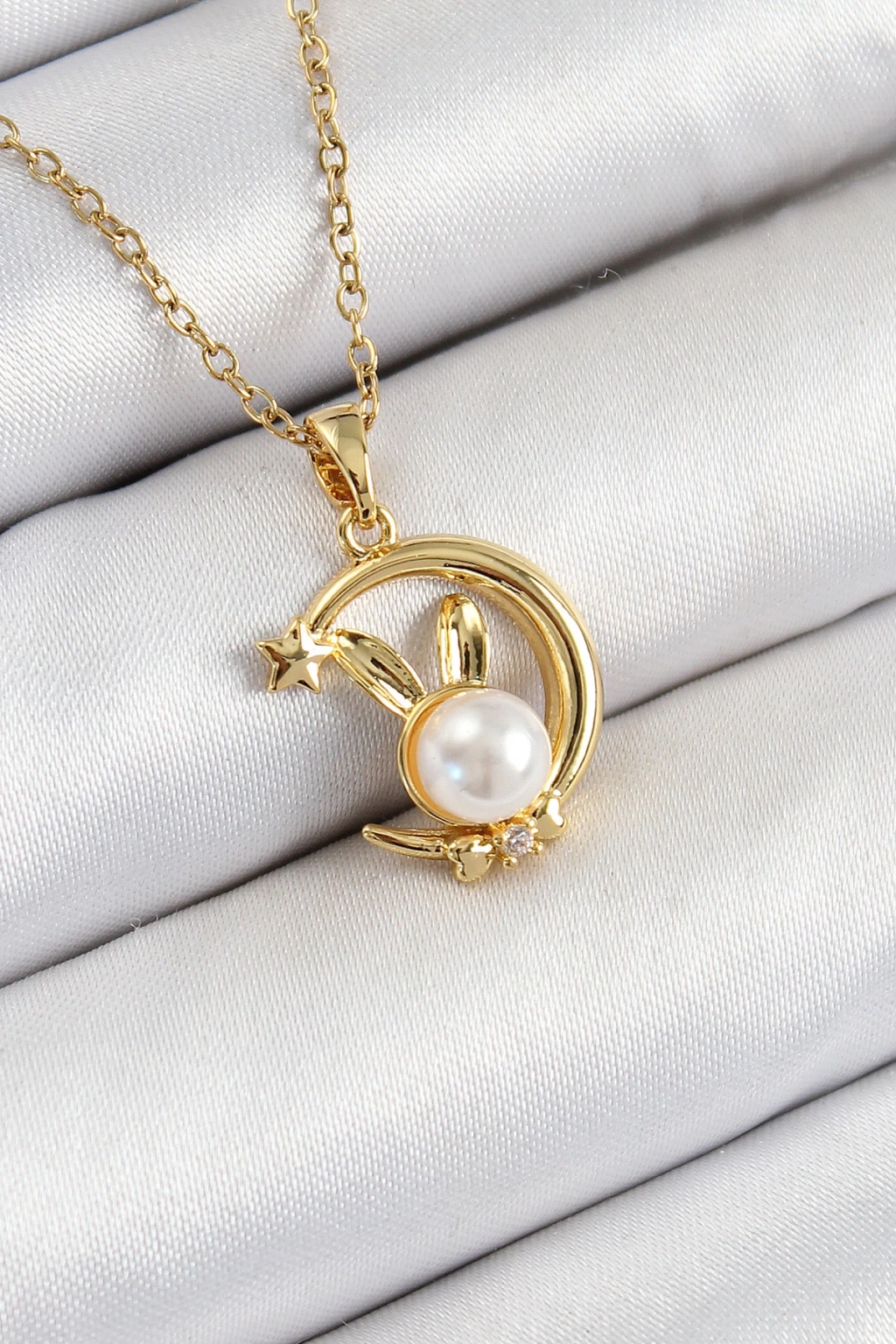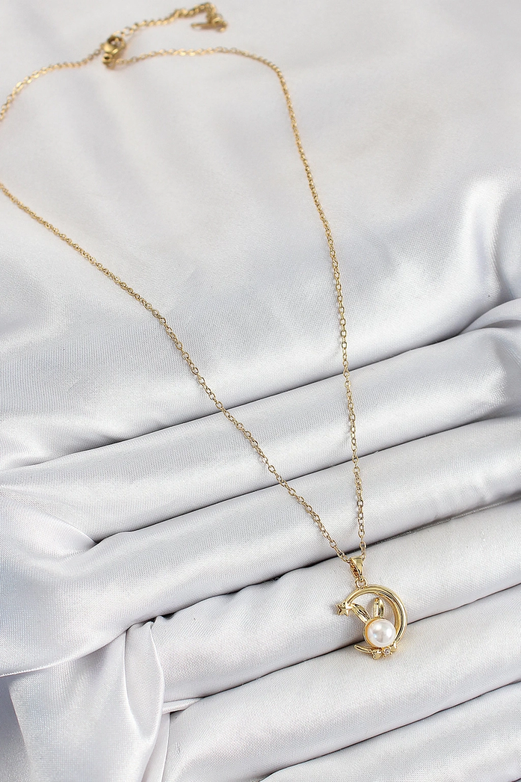 316L Çelik İnci Detaylı Hilal Tavşan Model Gold Renk Kadın Kolye - TJ-BKO10347